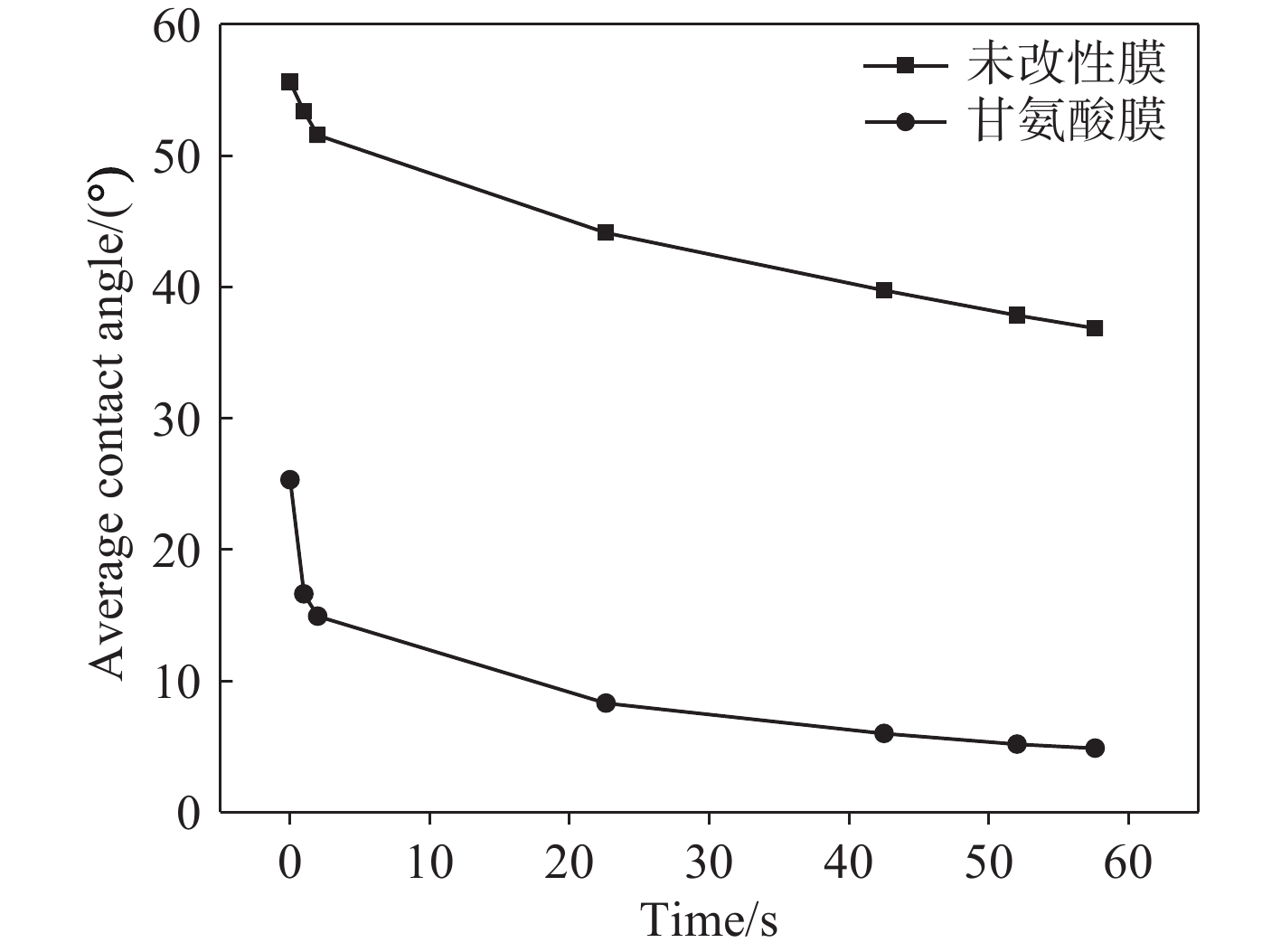 • 本实验比较了改性前后2种RC膜表面接触角的变化,示于图6。其中,未改性膜表面平均接触角为36.8°,经甘氨酸改性后,接触角平均值下降至4.8°。结合1.3节,证实了引入甘氨酸后膜表面化学组成和结构的改变使膜表面的亲水性增强,导致接触角减小。