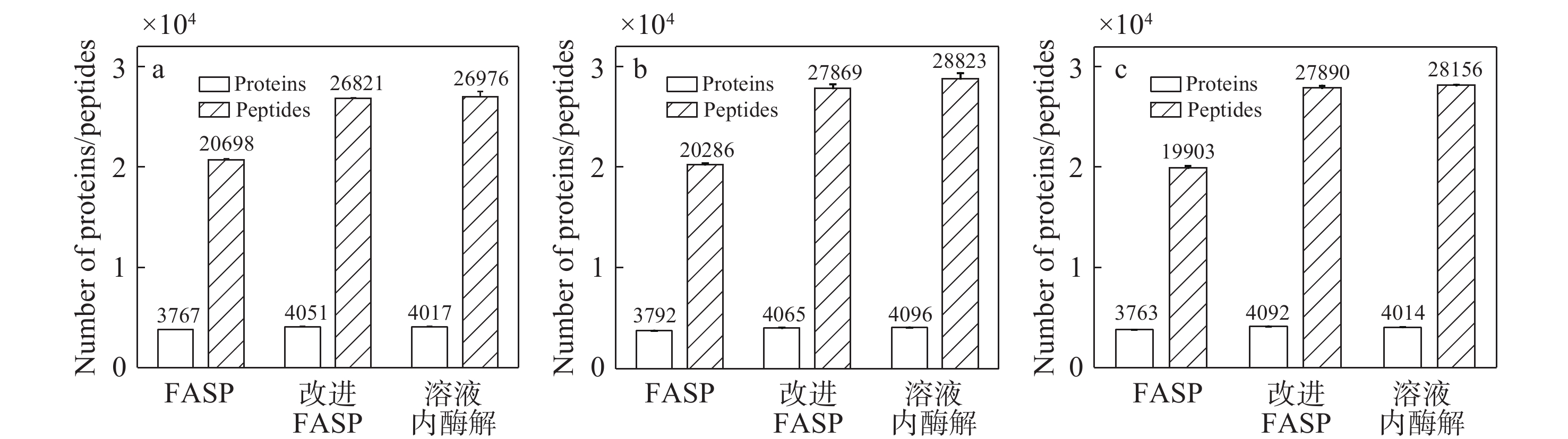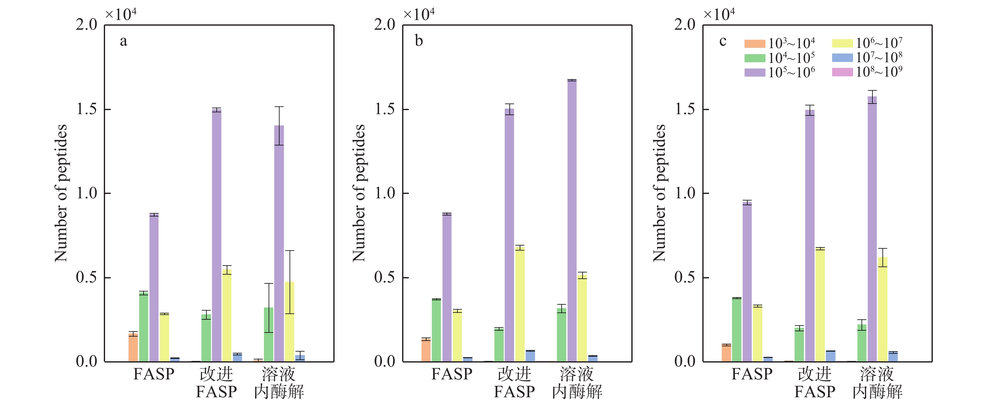 在不同样品前处理方法下,质谱定量检测到的肽段丰度分布示于图9。可以看出,3种不同裂解液提取蛋白后,与经典FASP方法相比,改进FASP方法检测到丰度大于104的肽段数量明显增多,丰度小于104的肽段数量明显减少。表明改进FASP方法能够获得更多的肽段,从而增强低丰度肽段的信号响应。此外,与溶液内酶解制样相比,改进FASP方法能检测到更多丰度大于106的肽段,且重现性更好。改进FASP方法鉴定到的蛋白和肽段数量比FASP方法明显增多,与溶液内酶解制样方法相当。