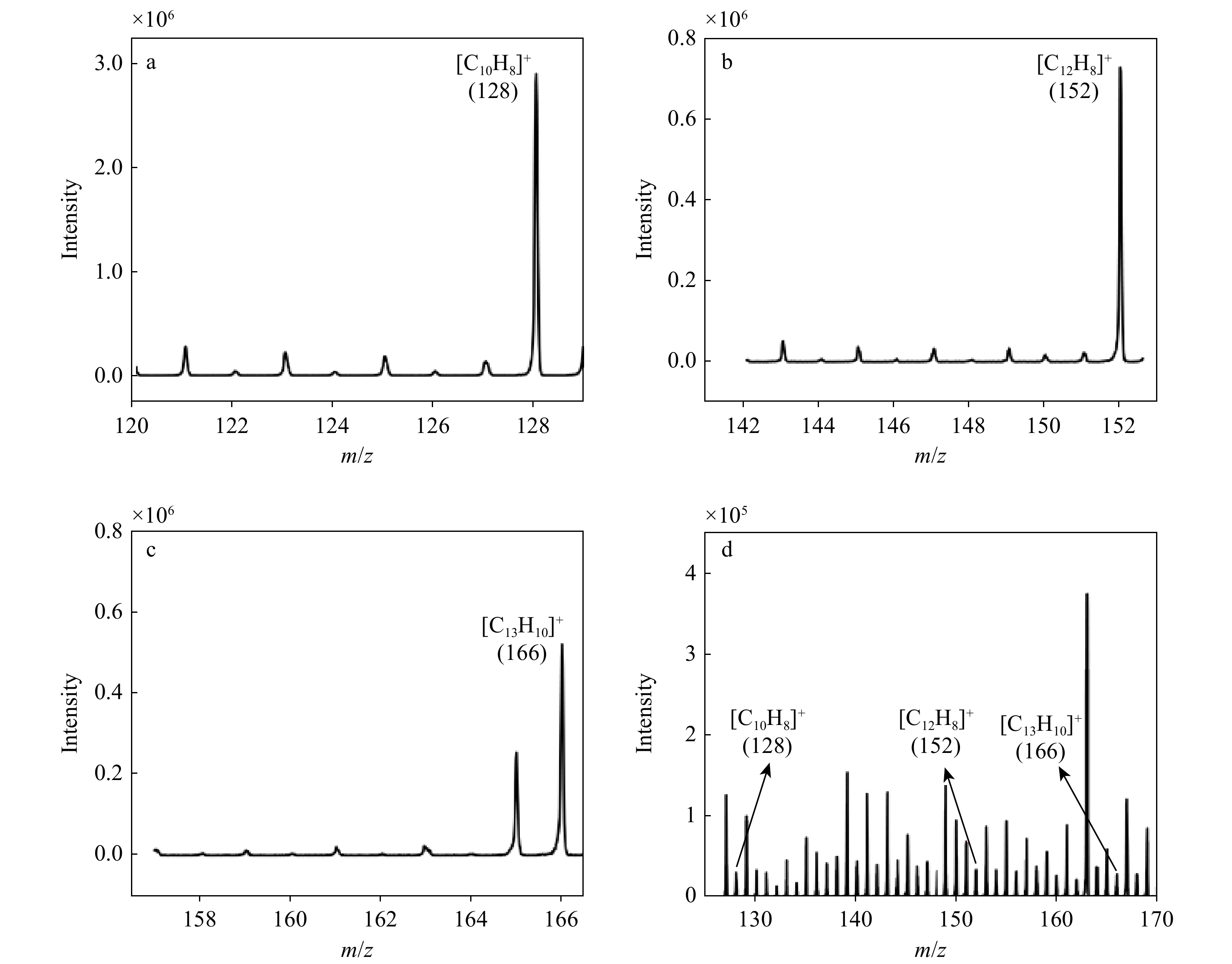 本工作采用真空紫外(VUV)灯光电离技术,在检测富含共轭电子体系的PAHs时展现出卓越性能。PAHs因独特的二维不饱和特性而具有较大的光吸收截面,其电离能低于8.2 eV阈值。萘、苊烯、芴标准样品质谱图示于图2。