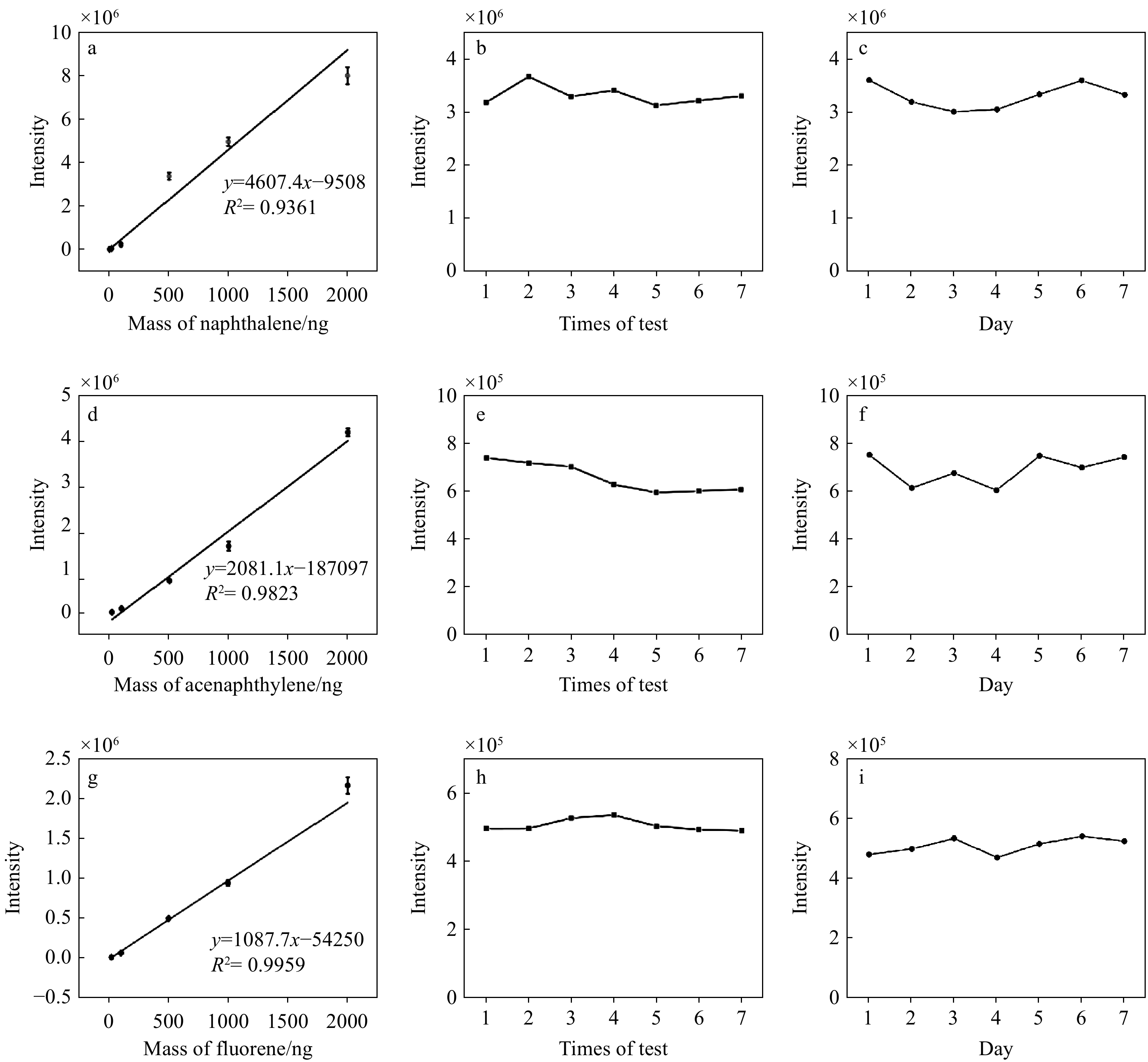 在2.1.1节优化的条件下,基于自主设计的热解吸装置耦合电离/聚焦一体化质谱系统对2~2 000 ng萘、苊烯、芴标准样品进行定量分析,线性相关系数分别为0.936 1、0.982 3、0.995 9,示于图3a、3d、3g。单日内对500 ng萘、苊烯、芴标准样品进行7次稳定性实验,信号强度分别在3.1×106~3.7×106、6.0×105~7.4×105、4.9×105~5.4×105之间波动,相对标准偏差分别为5.47%、9.44%、3.56%,示于图3b、3e、3h。连续7天对500 ng萘、苊烯、芴标准样品进行日间稳定性实验,相对标准偏差分别为7.22%、9.07%、5.39%,示于图3c、3f、3i。按照3倍信噪比计算得到萘、苊烯、芴标准样品的检测限分别为0.021、0.36、0.68 ng。