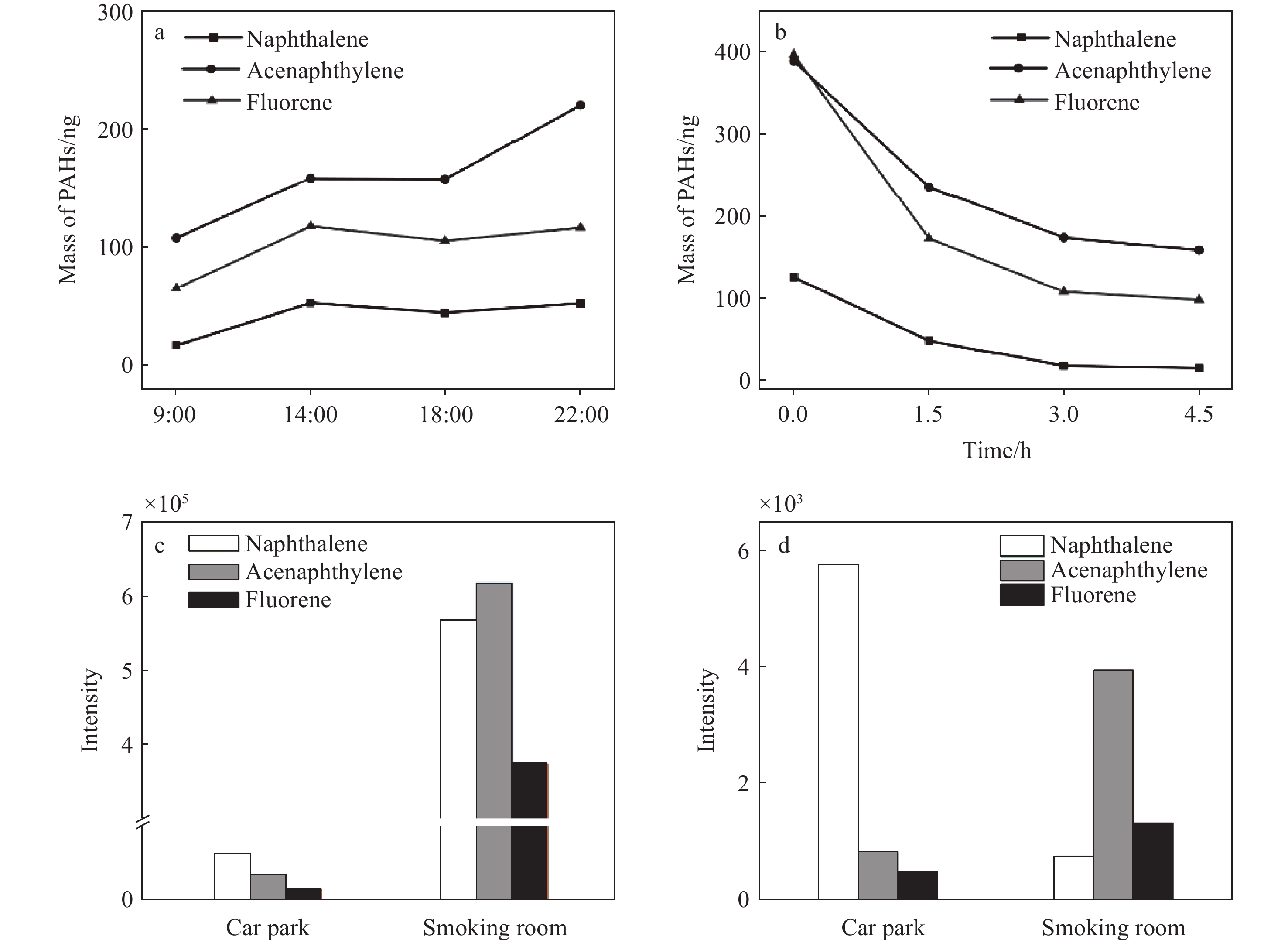 Figure 4. Mass change curves of naphthalene, acenaphthylene and fluorene in car park (a) and smoking room (b) particulate samples, and peak intensity diagrams of actual particulate samples detected by the self-designed thermal desorption device (c) and FIGAERO (d)