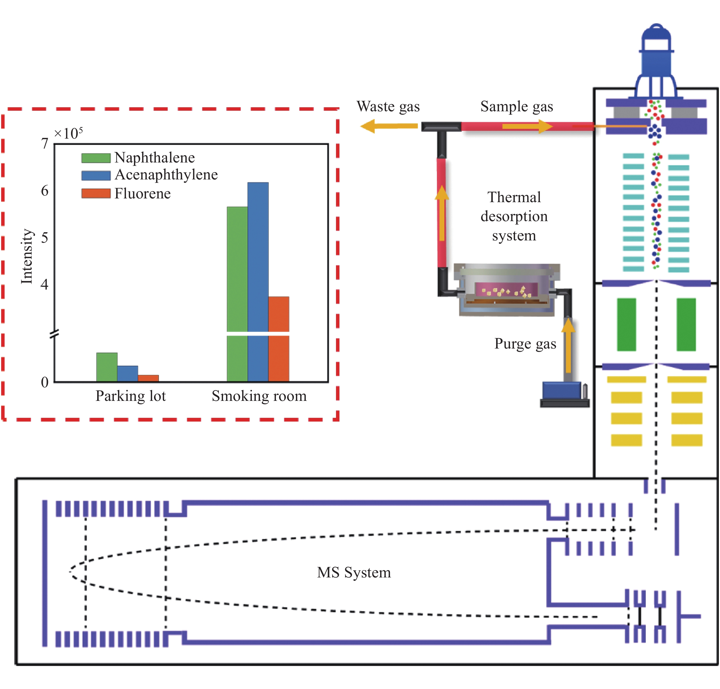 本工作自主设计了一种新型热解吸装置,通过与本课题组自主研发的电离/聚焦一体化质谱耦合,实现了对颗粒物中萘、苊烯、芴3种典型PAHs的定量检测。加热腔体中的样品经加热挥发后,在零气吹扫下进入质谱电离区实现离子化。热解吸装置耦合电离/聚焦一体化质谱系统结构示意图示于图1。