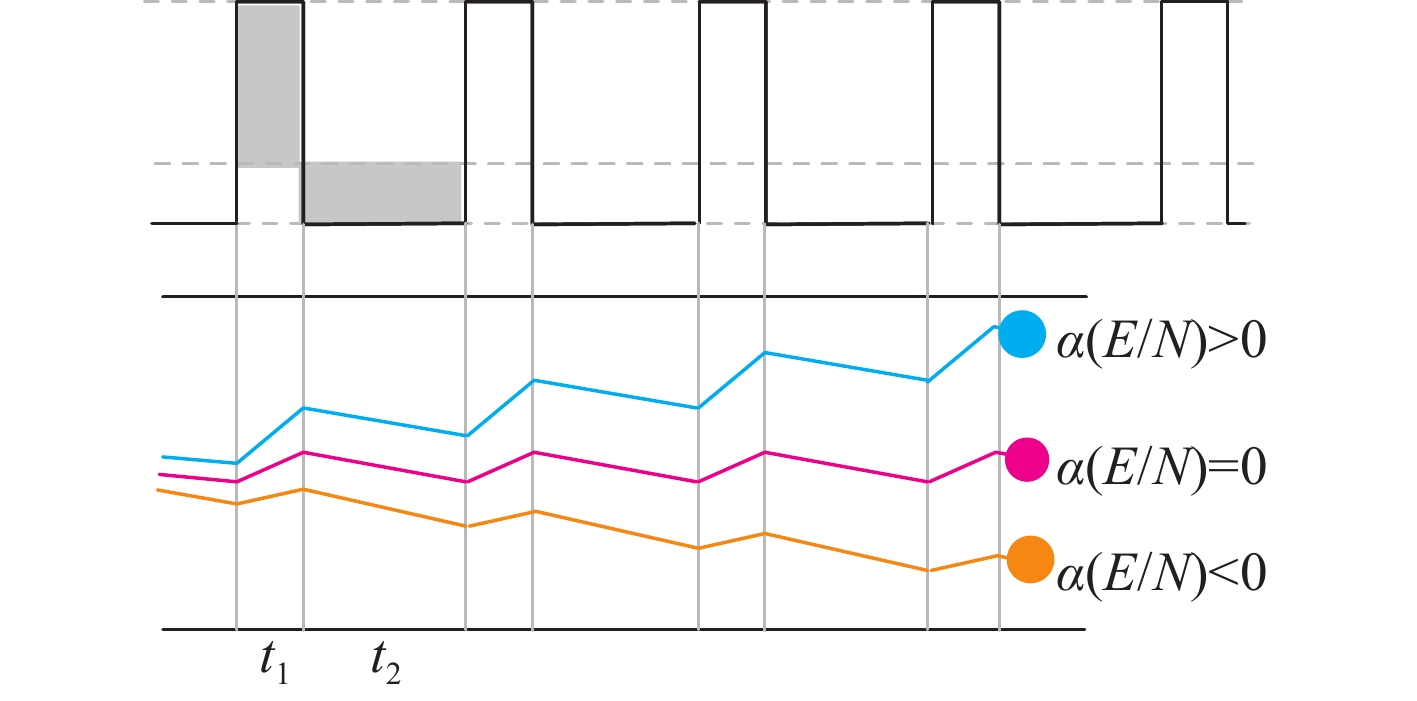 $ {K}_{\rm{high}} $ 随电场强度改变呈非线性变化,且不同离子的改变特性不同。$ {K}_{\rm{high}} $ 与有效迁移率系数$ \alpha (E/N) $ 有关,不同类型的离子在FAIMS中的轨迹示意图示于图1。在高电场$ {{t}}_{1} $ 和低电场$ {{t}}_{2} $ 交替周期内,由于离子的$ {K}_{\rm{high}} $ 与$ {K}_{0} $ 具有差异,离子在垂直方向产生周期位移差。$ \alpha (E/N) > 0 $ 的离子位移差大于0,会不断上升;$ \alpha (E/N) = 0 $ 的离子不产生净位移差;$ \alpha (E/N) < 0 $ 的离子位移差小于0,会不断下降。在迁移管内,水平气流和垂直脉冲的共同作用下,离子会呈Z字形的运动轨迹[5-8];在两极板间再施加补偿电压(CV),可使原本碰撞到分离通道壁的离子发生偏转,从而通过迁移区被后端检测器检测。FAIMS是基于非对称脉冲方波的周期内电压与时间积分为零设计的,所以实际分离电源波形越接近理想非对称方波,离子在迁移区的垂直位移就越精确,FAIMS的分离效果就越强,且分离电源频率越高,FAIMS灵敏度越高[9-10]。Krylov等[11]研究表明,采用接近矩形的分离电压波形能有效提高FAIMS的分辨率,但设计难点是需要耐压更高的高压设备与更复杂的功耗优化、散热设计。目前,常用的技术路径是多次波形叠加、反激升压和多硅基金属-氧化物半导体场效应晶体管(Si MOS)串联半桥[12]。其中,多次波形叠加电路易受电容、电感的干扰,导致各子波形难以精确叠加;反激升压的输出峰值电压高、功耗低,但波形与理想方波存在差异,且反激变压器的设计较复杂。在多Si MOS串联半桥方面,2008年,清华大学唐飞等[13]率先提出并设计了2 000 V/200 kHz半桥方波电源;2012年,电子科技大学李茂等[14]设计了功耗为90 W的2 000 V/200 kHz非对称半桥脉冲电源;2021年,清华大学钟伦超等[15]设计了1种三桥臂差分式的方波电路,降低了对直流电源的需求,能够输出1 660 V/189 kHz非对称方波。但这些电源大多以传统Si MOS为基础,在波形质量、功耗、频率方面还有提升空间。