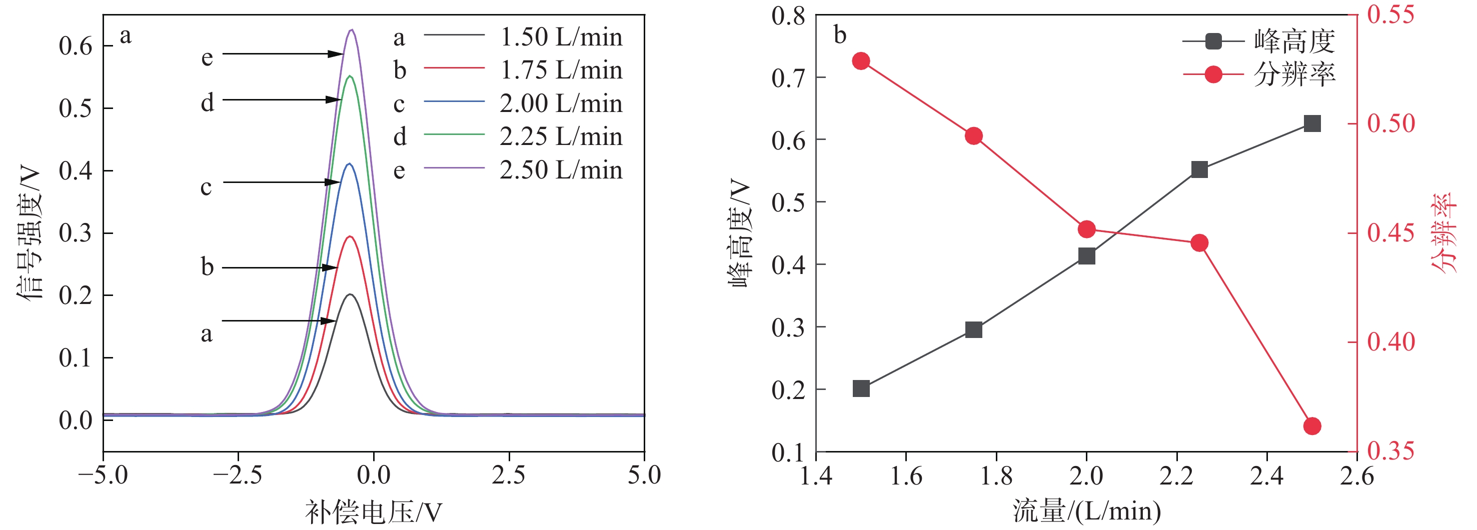 $ 1.5~2.5\;\,\mathrm{ }\mathrm{L}/\mathrm{m}\mathrm{i}\mathrm{n} $ 的水杨酸甲酯,FAIMS谱图示于图10。可见,随着载气流量的增大,峰高度不断增加,但分辨率降低,流量的改变不会显著影响离子峰的位置。载气流量的增大会促使离子通过FAIMS迁移区的离子迁移时间$ {t}_{{\mathrm{drift}}} $ 减小,从式(5)可得,载气流量与峰高度正相关,且迁移时间与峰高度负相关,所以增大载气流量可以提高峰高度。随着载气流量的增大,离子能够更迅速地通过分离通道,这需要使用更高的补偿电压才能将离子推向通道壁进行中和,从而增加了谱图的半峰宽,降低了FAIMS分辨率。因此,载气流量的取值需要权衡系统的分辨率和信号检测的灵敏度。 -