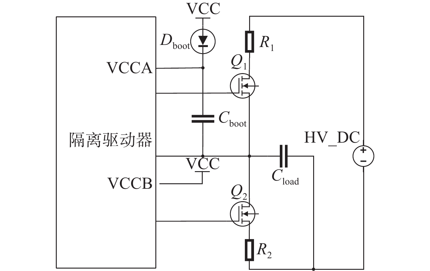 $ {Q}_{1} $ 、$ {Q}_{2} $ 分别为上桥、下桥的SJ MOS,HV_DC代表高压直流源,$ {C}_{\rm{load}} $ 为FAIMS分离通道金属极之间的等效电容,$ {C}_{\rm{boot}} $ 为上桥驱动的自举电容,$ {R}_{1} $ 、$ {R}_{2} $ 为限流电阻。当$ {Q}_{1} $ 导通时$ ,{C}_{\rm{load}} $ 电位会被拉至高压HV_DC电压轨;当$ {Q}_{2} $ 导通时,$ {C}_{\rm{load}} $ 电位会被拉至低电压轨,由此,FAIMS分离通道上就产生了高低电压切换的脉冲波。自举电容$ {C}_{\rm{boot}} $ 为$ {Q}_{1} $ 提供稳定的栅源压差VGS,当$ {Q}_{1} $ 导通、$ {Q}_{2} $ 关闭时,源端电位会变为HV_DC,若上桥驱动依旧采用VCC作为供电位,此时,VGS为负电压差,不符合MOS管开启要求。当添加$ {C}_{\rm{boot}} $ 后,在$ {Q}_{1} $ 导通、$ {Q}_{2} $ 关闭时,$ {C}_{\rm{boot}} $ 能维持两端电压差不突变,将上桥驱动供电位抬升至HV_DC+VCC,维持$ {Q}_{1} $ 处于开启状态。 -