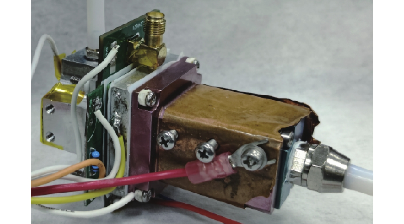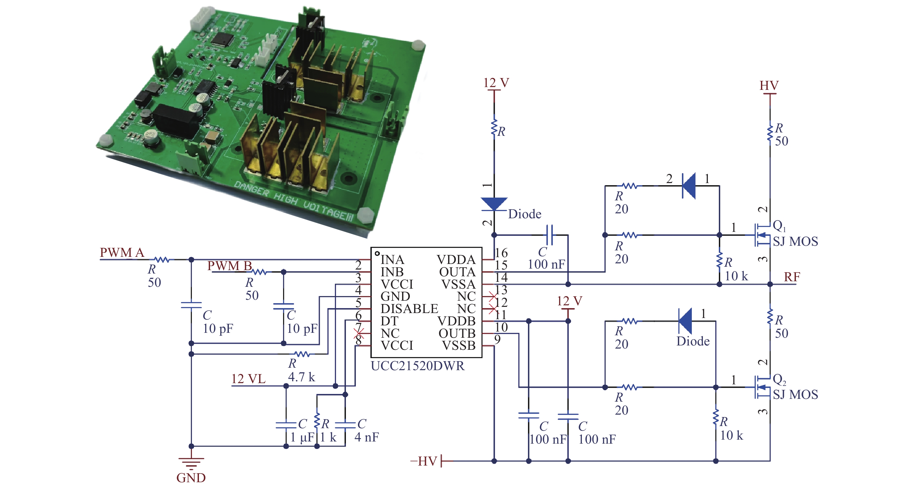 $ {Q}_{{\mathrm{g}}} $ 和导通电阻$ {R}_{{\rm{ds}}\left({\rm{on}}\right)} $ 对FAIMS脉冲电源的损耗有着决定性影响。$ {Q}_{{\mathrm{g}}} $ 越小,开启关断过程中的功耗越少,从而提高了开关速度和能量转换效率;$ {R}_{{\rm{ds}}\left({\rm{on}}\right)} $ 越小,导通过程中的功耗越少。本文基于图2的电源拓扑结构,选用新式开关器件高压SJ MOS作为FAIMS脉冲电源的核心器件。与传统Si MOS相比,SJ MOS通过在其漂移区嵌入交替排列的P型和N型半导体层,创建了多个垂直PN结,当施加电压时,这种结构可以有效减少$ {Q}_{{\mathrm{g}}} $ 和$ {R}_{{\rm{ds}}\left({\rm{on}}\right)} $ 。在设计半桥电路的驱动电路时,需要考虑其具备快速驱动MOS管与隔离保护的能力。因此,本文选择德州仪器公司生产的隔离式双通道栅极驱动器UCC21520DWR。在供电12 V、输出负载电容1.8 nF时,该驱动芯片上升时间为6 ns、下降时间为7 ns,峰值输出电流为6 A,具备快速切换的能力。同时,该驱动器能提供5.7 kVRMS的电压隔离强度,可有效隔离射频电源的低压侧和高压侧。此外,为了防止射频电源因上、下桥MOS管的导通延时而短路,将驱动电路死区时间设置为10 ns,这样兼顾了FAIMS电源的高频切换和稳定性。另外,为了优化该FAIMS电源的热稳定性,本文在SJ MOS附近紧密布局了大量U形散热片,该散热片由导热性能更好的铜制成,U型布局可以提高有效散热面积。基于上述思路设计的高压射频脉冲电源实物图示于图3,模块尺寸仅为$ 13\;\,\mathrm{ }\mathrm{c}\mathrm{m}\times 11.7\;\,\mathrm{ }\mathrm{c}\mathrm{m} $ 。 -