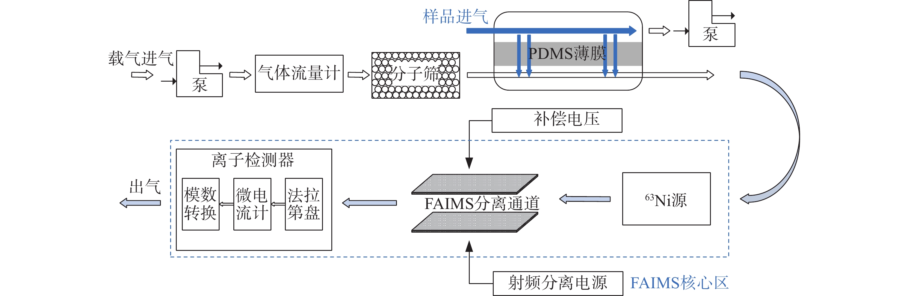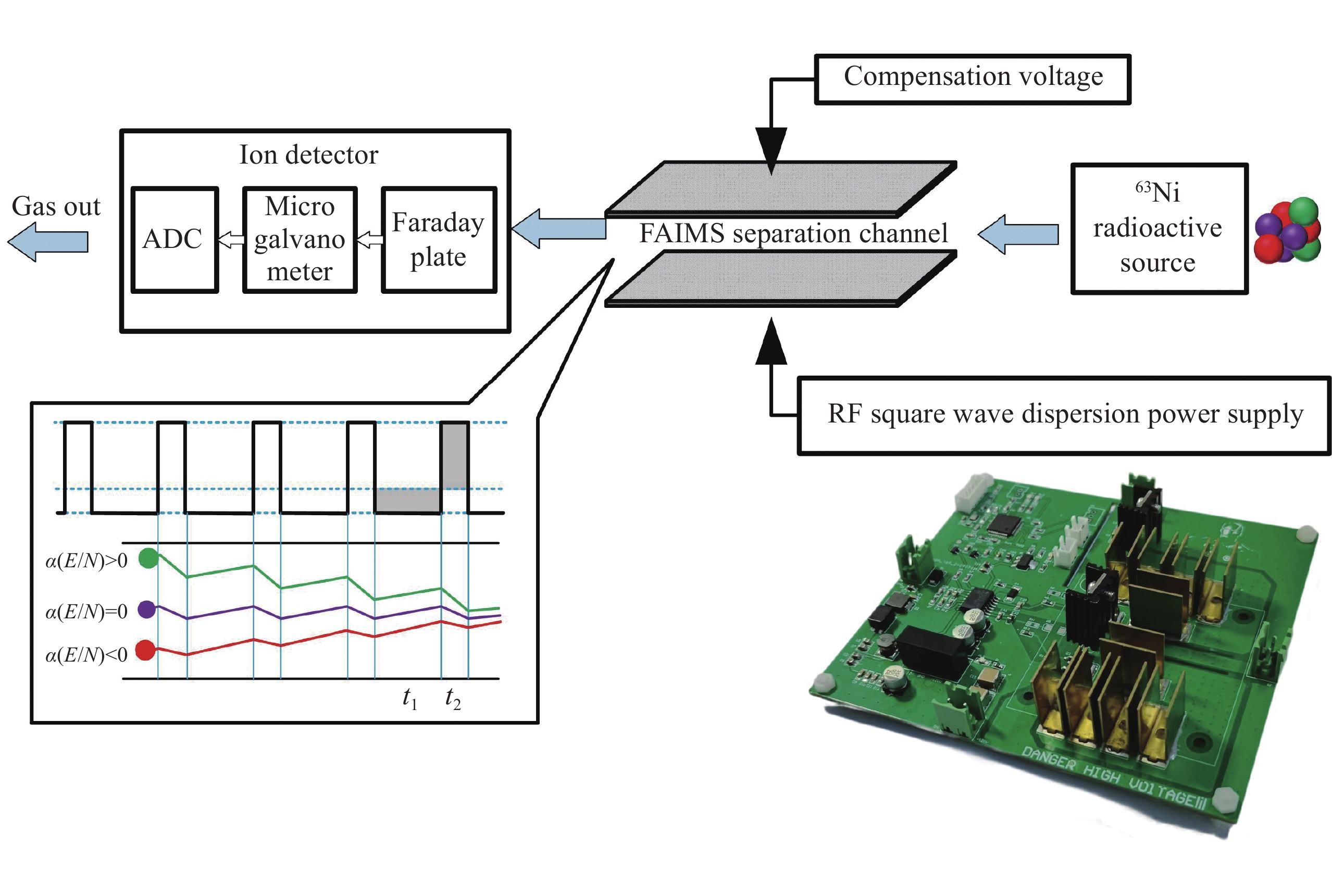 高场非对称波形离子迁移谱(FAIMS)是一种由离子迁移谱演变而来的化学分析技术,其利用离子在高、低强度电场下离子迁移率K的差异,对不同物质进行筛选分离[1-2],具有灵敏度高、便携、集成度高和制造成本低的优点[3-4]。