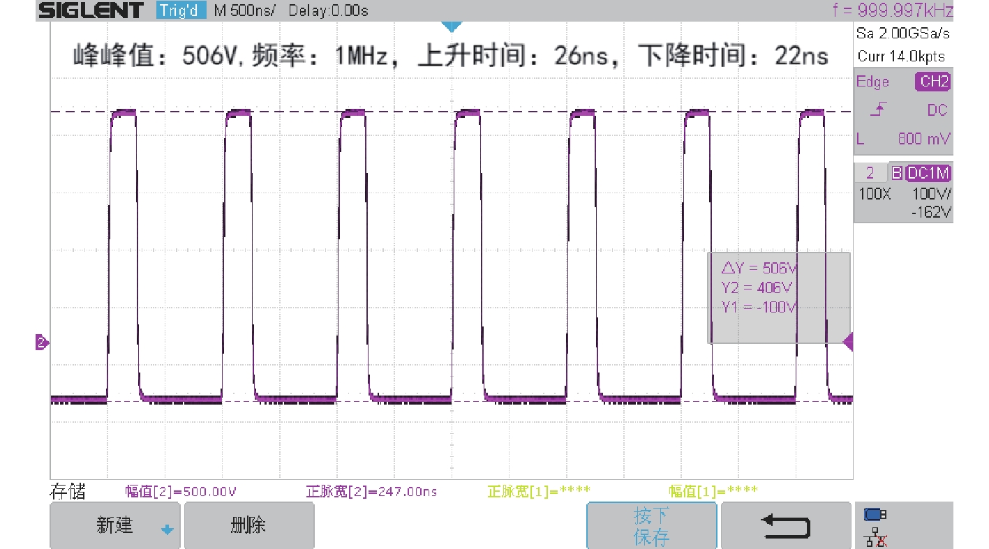 对图3中的高压射频电源实物进行测试,输出波形示于图6。脉冲波形的峰-峰值为506 V,频率为1 MHz,上升时间为26 ns、下降时间为22 ns,具有输出电压值高、开关切换速度快的能力;在506 V/1 MHz条件下的工作电流为57 mA,总功率仅为29 W,其上升、下降沿的尖峰过激均小于1.6%,波形完整性较优;输出的脉冲波形峰值平稳,一致性表现优异,与FAIMS理想工作条件中的脉冲方波接近,符合FAIMS的设计需求。当工作频率为1 MHz时,电源能输出峰-峰值0~506 V可调的宽电压范围脉冲方波,且不同峰-峰值条件下的输出波形均具有较好的一致性。电源工作频率和占空比由微处理器生成的脉宽调制信号(PWM)控制,该信号可快速调节电源频率在1 Hz~1 MHz范围内变化。