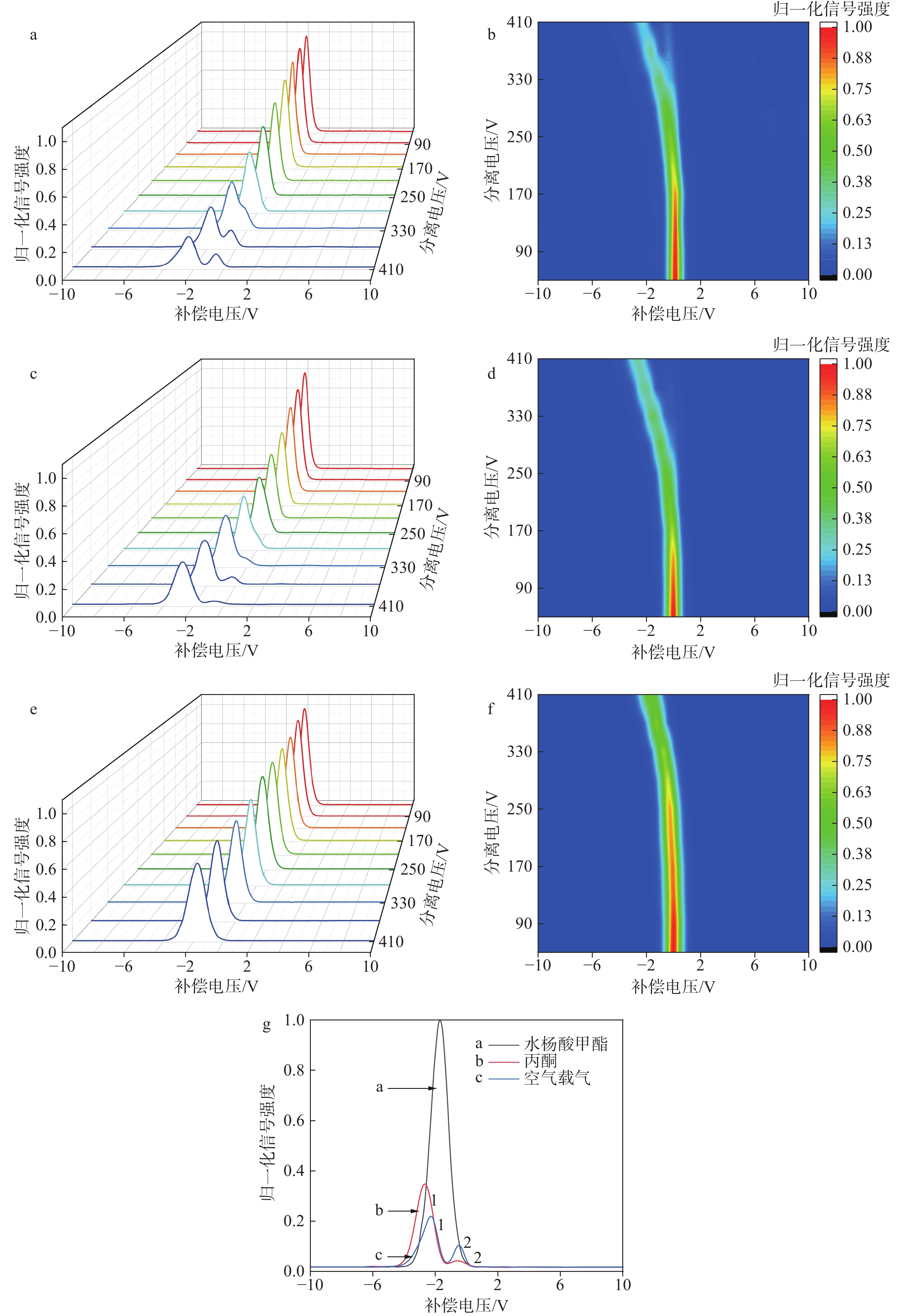 从图7c可以看出,在射频分离电压幅值达到330 V时,丙酮的谱图出现双峰特征,随着射频分离电压幅度的增大,特征双峰的距离拉大,分辨更清晰。这主要是因为离子的高场迁移率