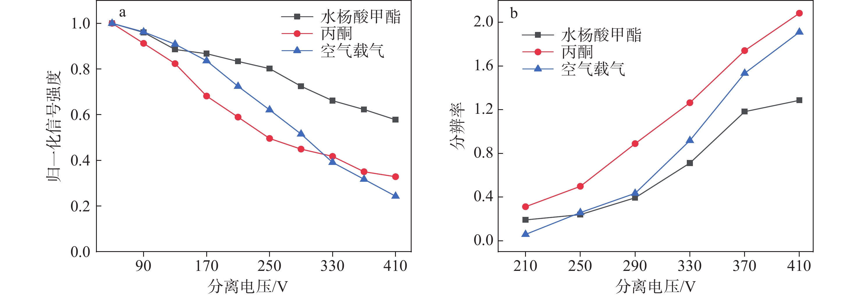 $ \Delta d $ 越大,与分离通道壁距离小于$ \Delta d $ 的离子会碰撞到通道壁被中和,导致峰强度减弱。从图8b可以看出,增大射频电压幅值可以有效提高FAIMS分辨率,这是因为提高射频电压幅值增大了损耗高度$ \Delta d $ ,减小了半峰宽。同时,由式(7)可得,更高的射频电压需要更大的补偿电压使离子通过分离通道。分辨率与半峰宽负相关,与最大峰强度处的补偿电压绝对值正相关,这2个因素共同提高了FAIMS分辨率。由实验可以看出,提高射频电压幅值可以优化FAIMS分辨率,但会损失较大的灵敏度;而降低射频电压幅值虽然能提高灵敏度,但分辨率不佳。因此,分离电压的选择需要综合考虑对二者的影响。