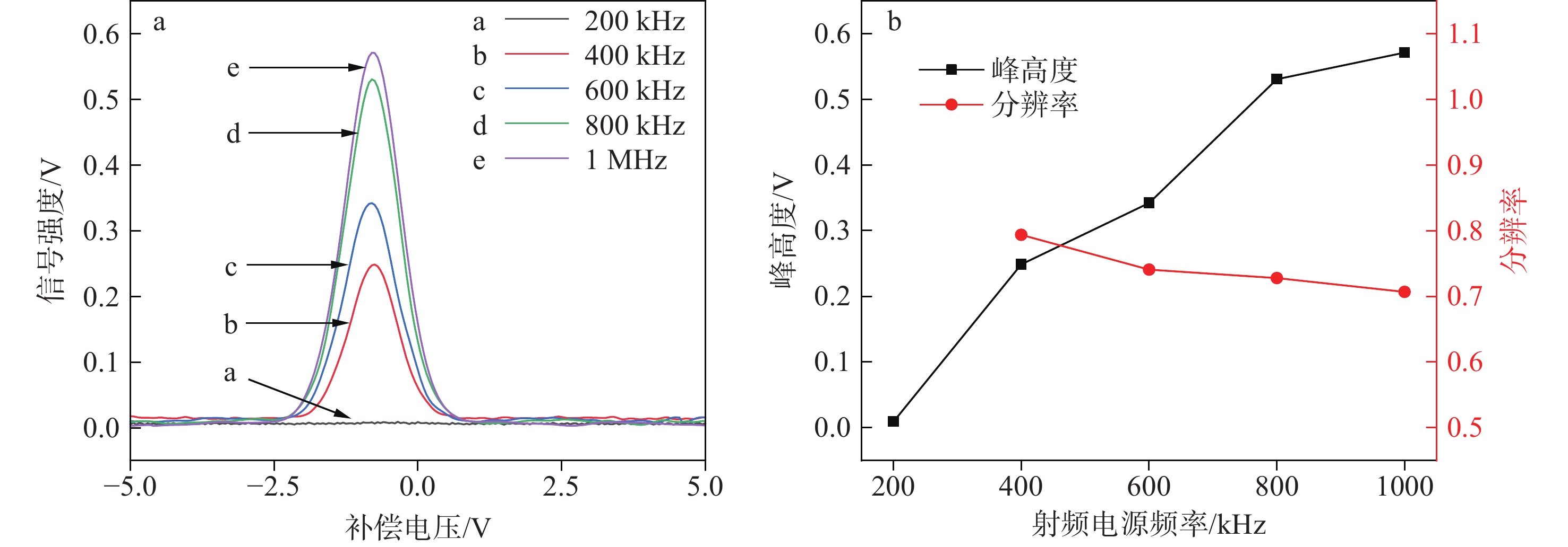 $ \Delta d\ll d $ ,因此,半峰宽的增大幅度很小。根据式(7)可得,最大峰强度处的补偿电压$ {CV}_{{\mathrm{p}}} $ 只与分离电压有关,提高射频频率不改变最大峰强度处的补偿电压,因此分辨率会略微下降。实验结果表明,提高射频电源频率能够明显优化FAIMS灵敏度,虽然会降低FAIMS分辨率,但降低幅度很小。