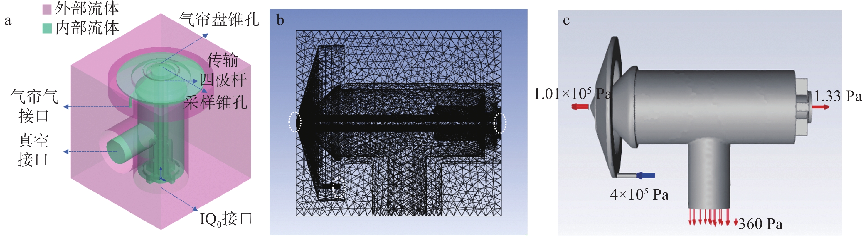 • 由于实际输入的气帘气为纯度高于99.9%的氮气,因此,在本次流体仿真中,将外部环境和一级离子导引系统的流体介质均设定为氮气,采用理想气体模型描述。边界条件为压强边界条件,其中,气帘气接口设为流体入口,压强为4×105 Pa;气帘盘锥孔设为流体出口,压强为1.01×105 Pa;真空抽口设为流体出口,压强为360 Pa;IQ0接口设为导引系统出口,压强为1.33 Pa,整体边界条件示于图1c
