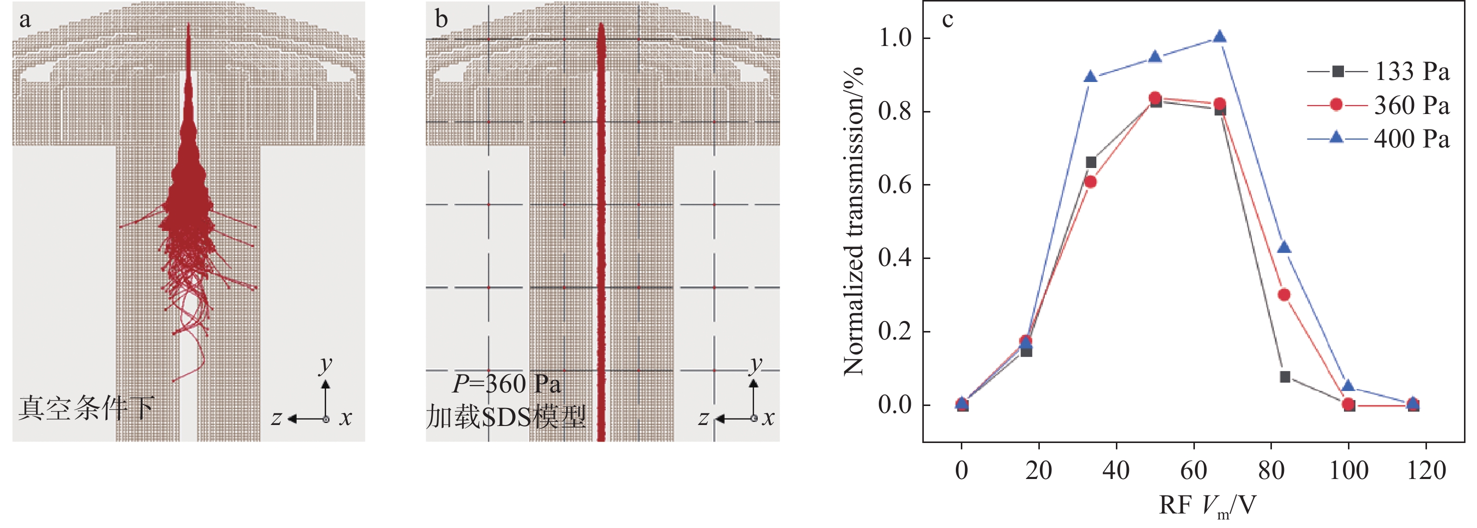 Figure 10.  Ion flight trajectories in the y-z plane (partial view) under vacuum conditions (a) and with the SDS model applied (b), ion transmission rates under different pressures (c)