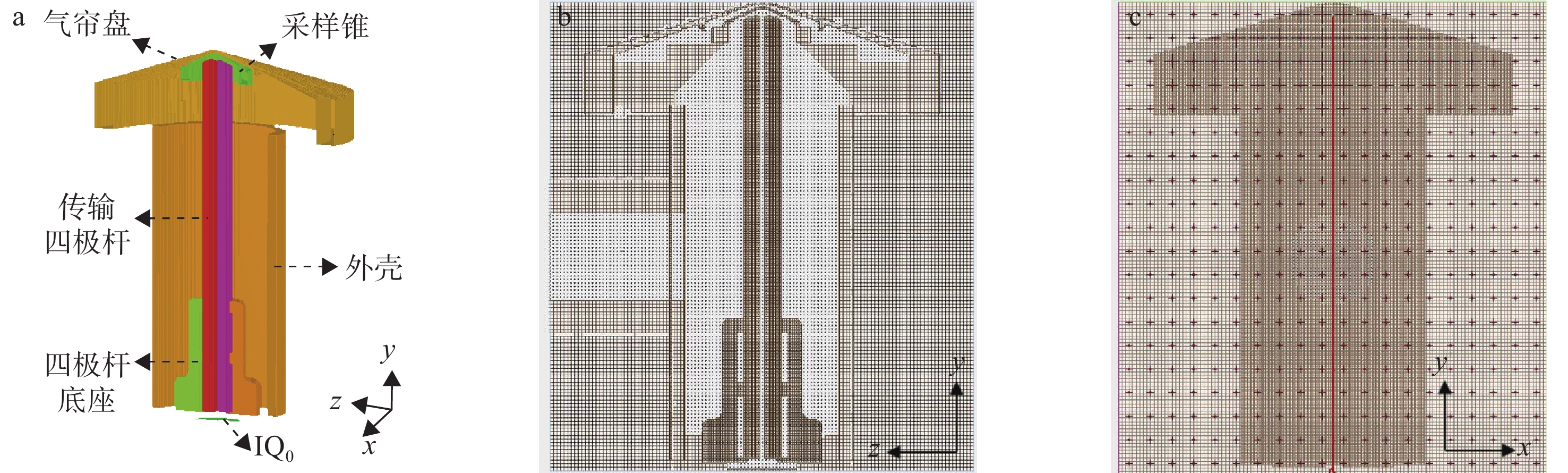 • 一级离子导引系统的离子光学仿真几何模型示于图2a。为简化模型,仅画出实际电极,包括气帘盘、采样锥、传输四极杆、四极杆底座、外壳以及IQ0