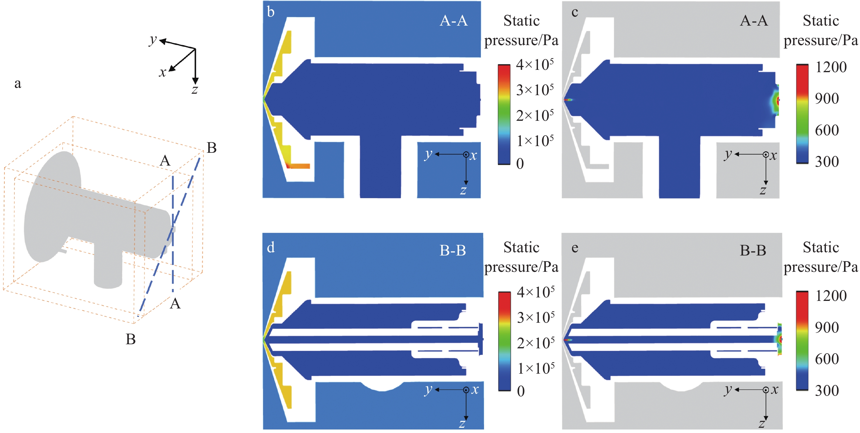 Figure 3.  Schematic of the A-A and B-B cross-sectional planes for primary ion guide system (a), static pressure distribution (b) and internal fluid distribution (c) at the A-A cross-sectional plane, static pressure distribution (d) and internal fluid distribution (e) at the B-B cross-sectional plane