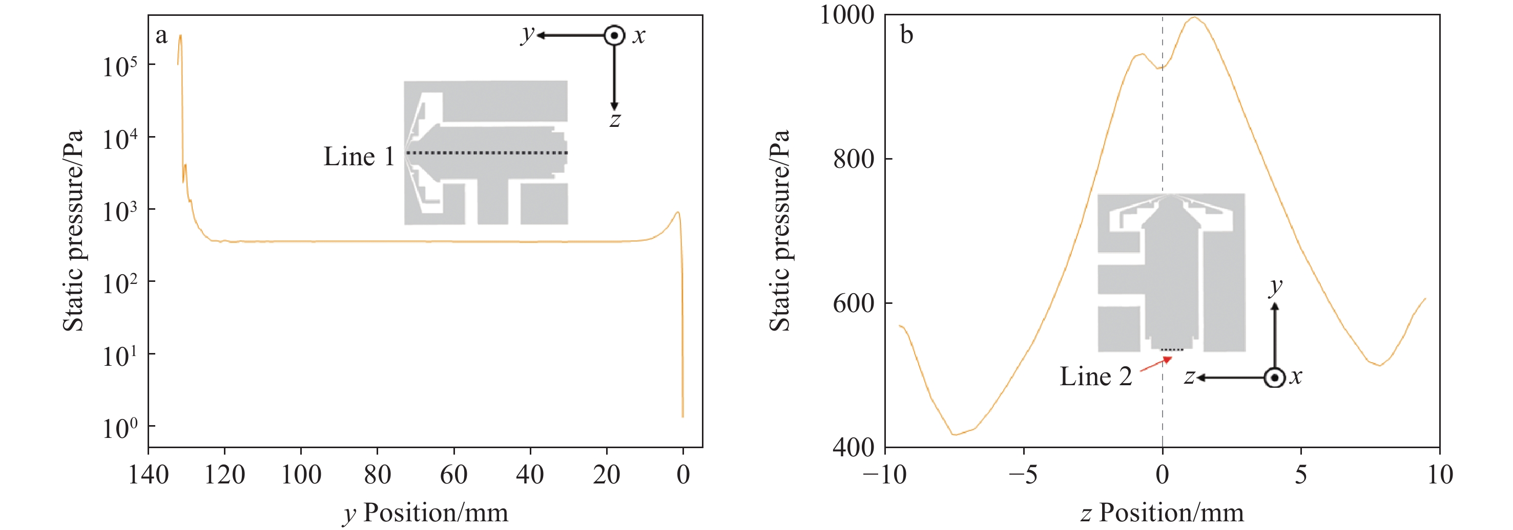 为进一步量化压强分布情况,提取A-A截面上2条直线的静态压强分布数据。线1位于整个离子导引系统的y轴方向中轴线,以IQ0透镜的圆心为零点,沿y轴延伸至气帘盘的圆心,线段总长度132 mm,其静态压强分布示于图4a。从气帘盘到采样锥,再到主通道区域,静态压强从大气压快速降至360 Pa,并在此过程中出现2个压强尖峰,分别位于131.30、129.98 mm处。其中,131.30 mm处对应几何结构中的采样锥锥孔,压强急剧上升主要与该区域的几何尺寸变化和高压气帘气有关;而129.98 mm处则与该区域由于超音速气流形成的马赫盘效应有关。接近IQ0出口时,压强突然升高至906 Pa,随后快速下降,在IQ0出口处降至边界条件下的1.33 Pa。为进一步探讨z方向的压强分布对称性,绘制了A-A截面在y=1.31 mm处沿z方向的静态压强分布,示于图4b。在z=0 mm处,静态压强为926 Pa,左右两侧的压强变化趋势对称,但静态压强值存在明显差异,主要归因于几何结构中气帘气接口与真空接口在y方向的几何不对称性。