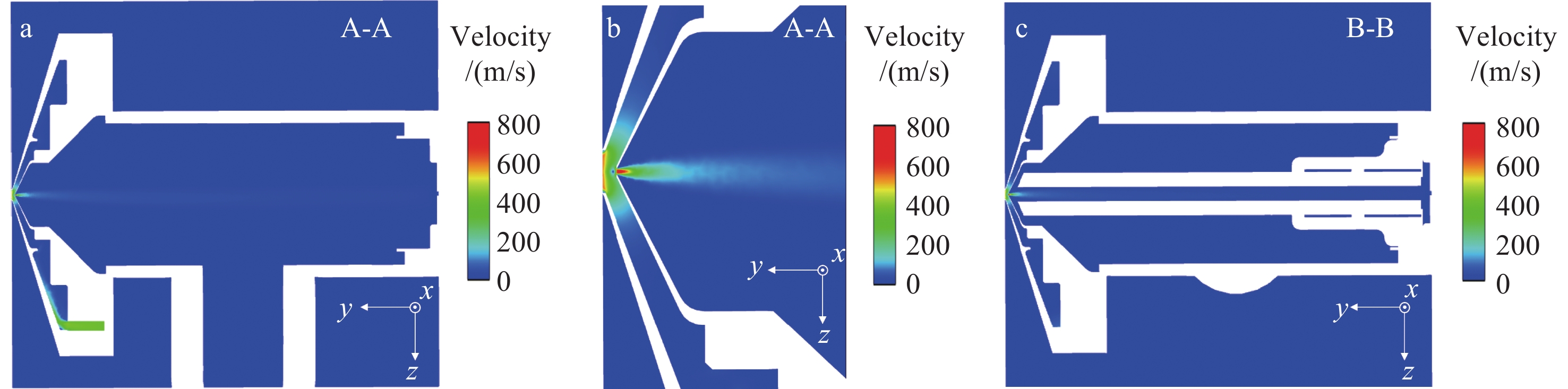 Figure 5.  Velocity distributions of A-A cross-sectional plane (a), near the atmospheric pressure interface (b), B-B cross-sectional plane (c)