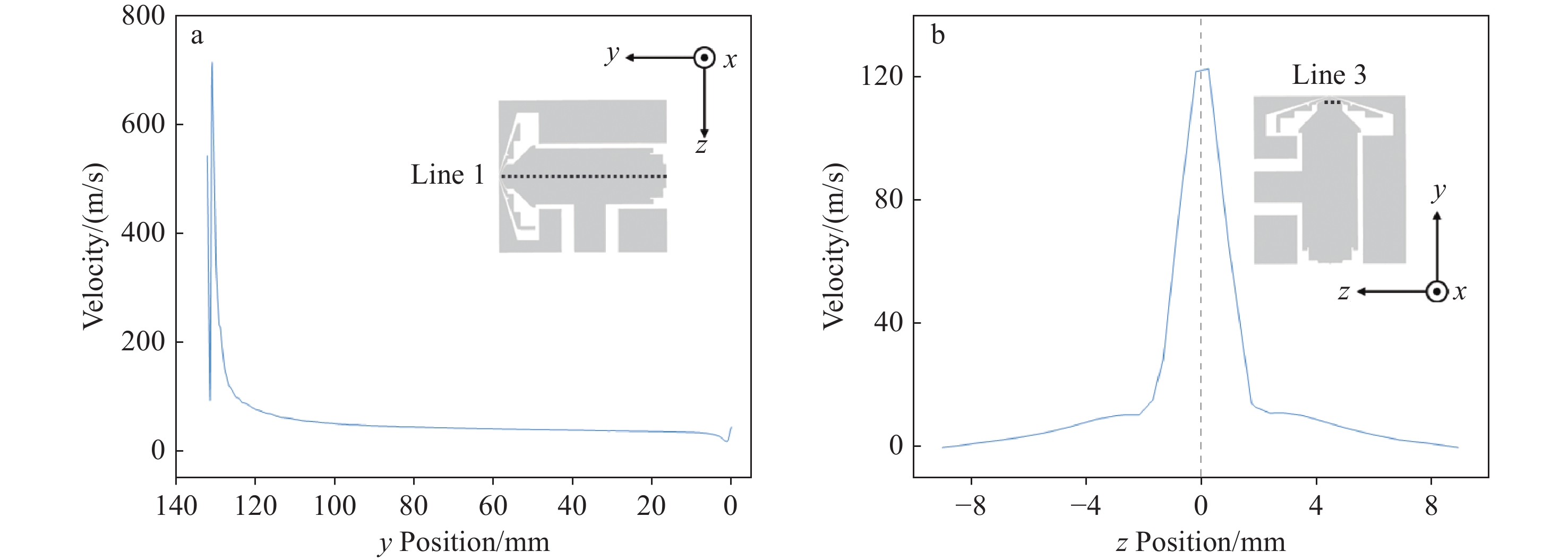 为进一步量化压强分布,提取A-A截面2条直线上的流速分布。线1的速度分布示于图6a,从气帘盘至采样锥,再到主通道初始区域,流速从最大值713 m/s快速降至100 m/s。在此过程中,出现2个速度尖峰,分别对应图4a中该区域的2个压强低谷,这与伯努利方程中的能量守恒原理一致。随着y值减小,流速逐渐减缓,靠近IQ0出口处时,流速突然降至21 m/s,该变化趋势与图4a中对应区域的压强变化相吻合。y=125 mm沿z方向的流速分布示于图6b,其呈现关于z=0基本对称性,靠近y轴方向中轴线的位置流速较大,而边缘处流速接近0 m/s。