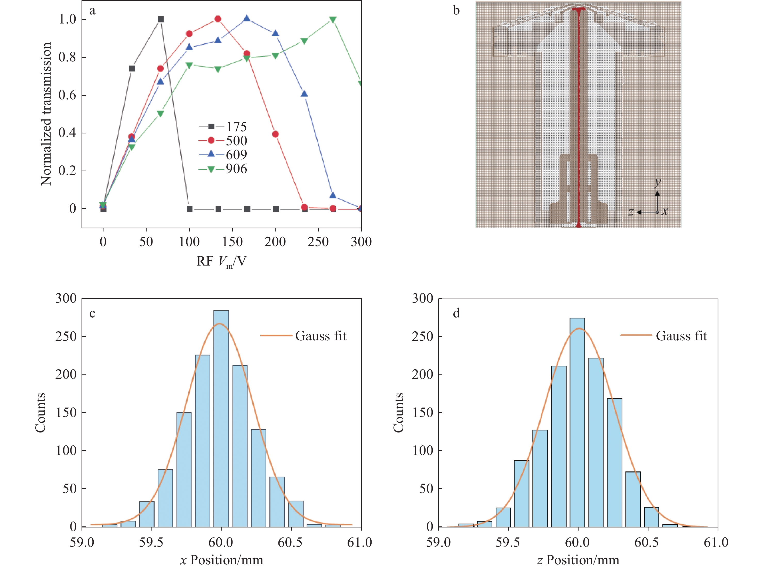 Figure 8.  Ion transmission rates of ions with different m/z under different RF voltages (a), flight trajectory of m/z 175 in the y-z cross-section at an RF voltage of 100.2 V (b), and distributions of m/z 175 in x-direction (c) and z-direction (d) on the IQ0 cross-section