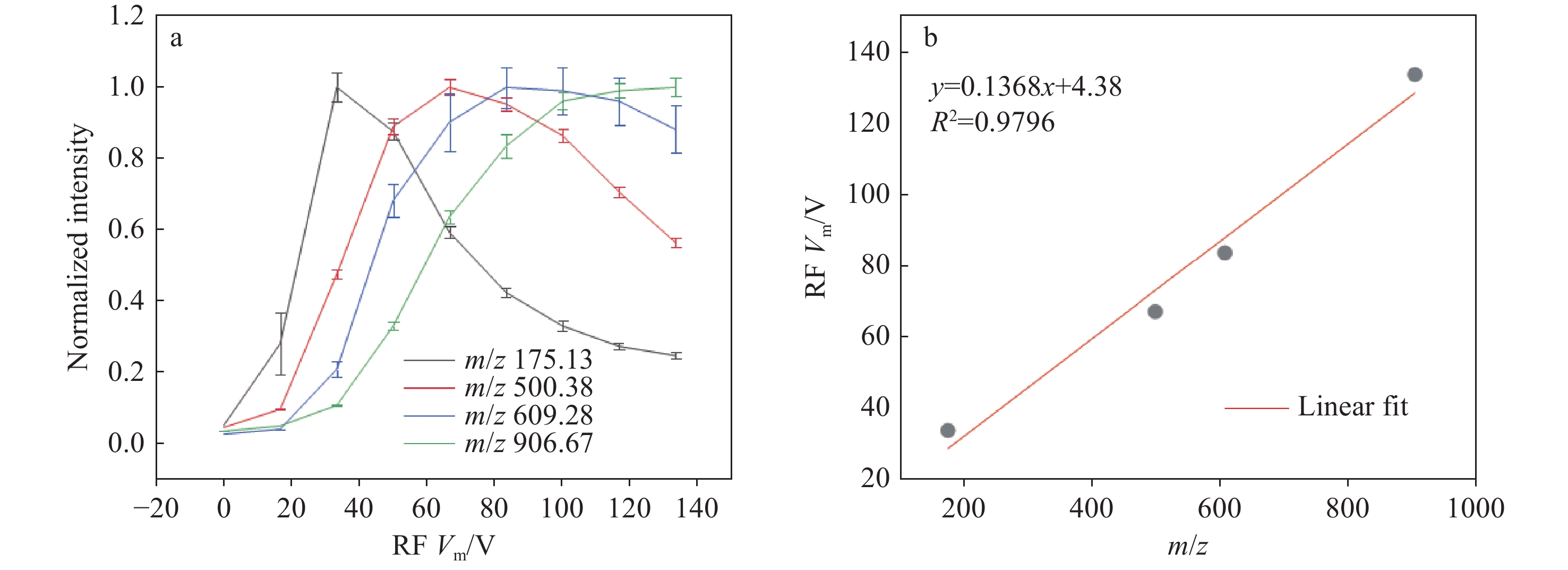 本研究建立了质荷比与射频电压之间的线性关系,示于图9b,质荷比与射频电压峰值之间的关系可以表示为:
