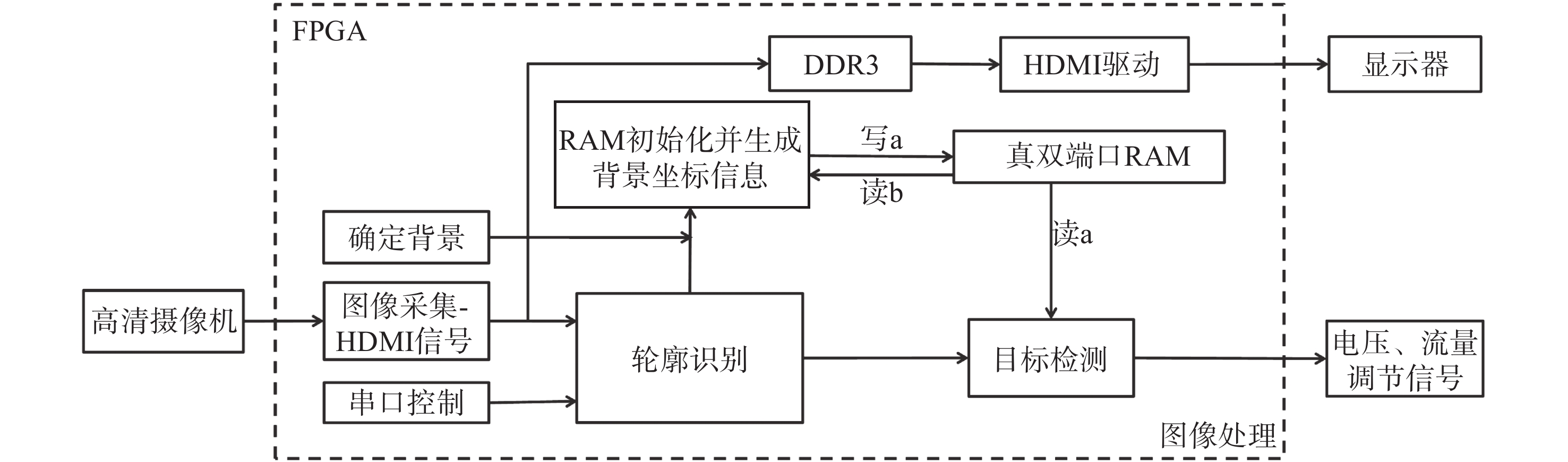 最佳喷雾形态是以喷雾针尖端为顶点的宽锥形,存储喷雾的上下2条边界坐标作为其轮廓信息。视频流以HDMI信号输入到FPGA中,依次进行图像滤波和边缘检测。首先确定最佳的喷雾形态为背景帧,通过遍历整帧图像将边界存储于RAM中;后续经过处理的视频流进入目标检测模块,遍历整帧图像找到当下喷雾的边界信息,并与RAM中存储的背景信息进行对比。若喷雾超出最佳喷雾范围,则通过降低电压或减小进样速率缩小喷雾形态;若喷雾小于最佳喷雾范围,则通过增加电压或增大进样速率扩大喷雾形态。自动控制的具体操作流程如下:激发电压的调整采用DAC配合高压电源实现,进样速率的调整采用串口控制进样泵实现;首先设立DAC及串口发送数据的初值,再依据目标检测模块传出的信号增大或减小数值。目标检测模块以1帧为单位对比当前喷雾与背景喷雾的差距,并传出调整信号,传出的信号包括2个方面:首先判断当前喷雾的2条边界是否超出背景喷雾范围,以此传出调整信号的方向,即增大或减小信号;其次,通过遍历整帧图像计算当前帧图像与背景图像不重复的像素点个数,依据差值像素点个数得出调整信号的幅度大小。最后,将视频流缓存于DDR3中,通过HDMI驱动模块将其读取并显示在屏幕上,以此实时监测喷雾状态。具体流程图示于图1。