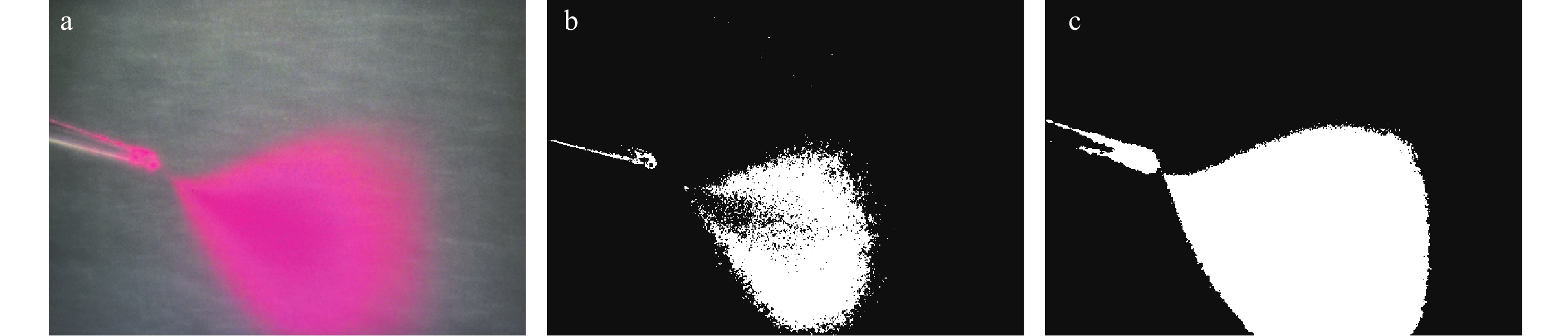 由于喷雾与空气的反射率差异较大,通过多次实验测试即可得出合适的阈值。为更好地体现测试效果,根据灰度值和反射率值将原始图像进行二值化,即将大于阈值的像素点设置为白色,小于阈值的像素点设置为黑色,实验结果示于图2。