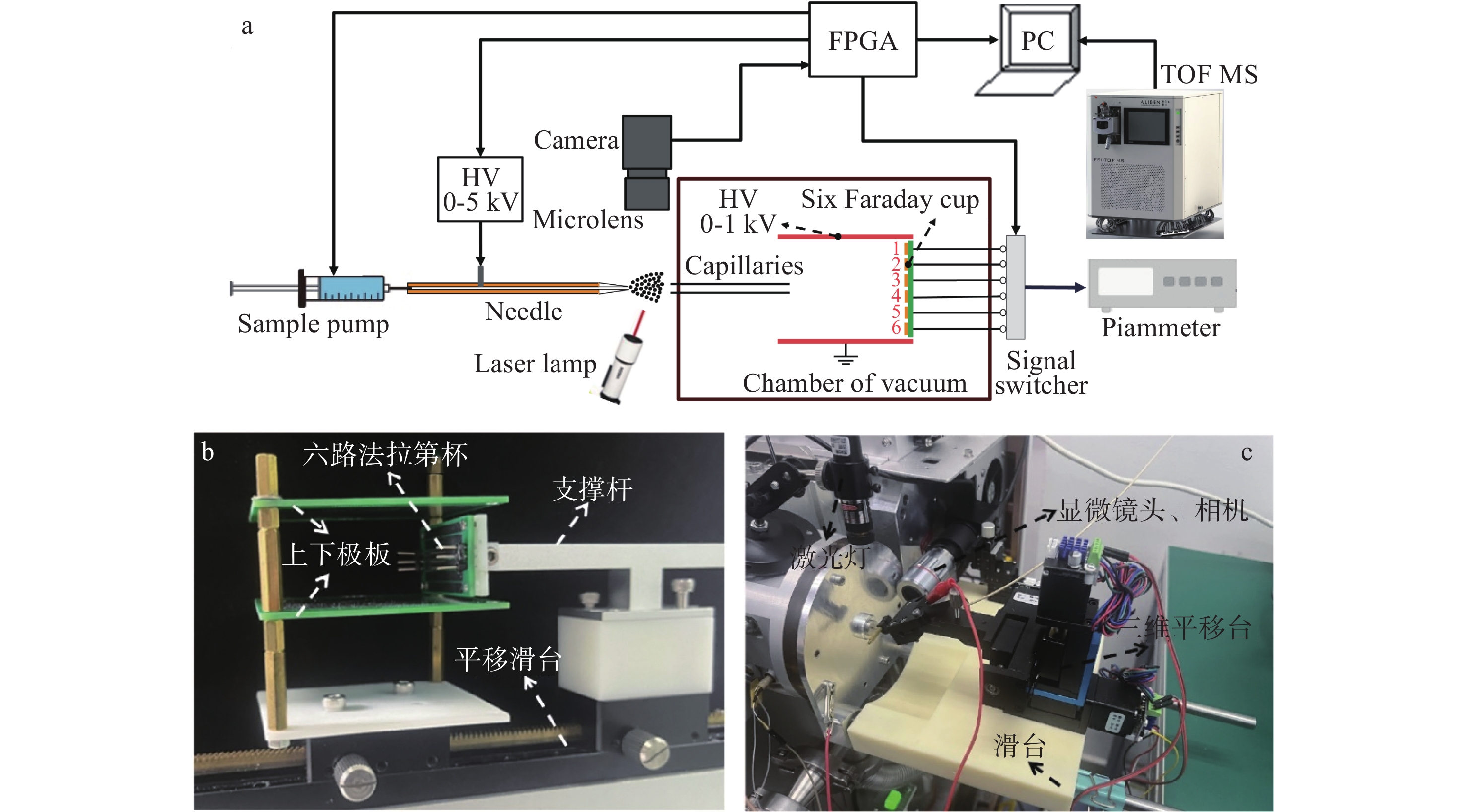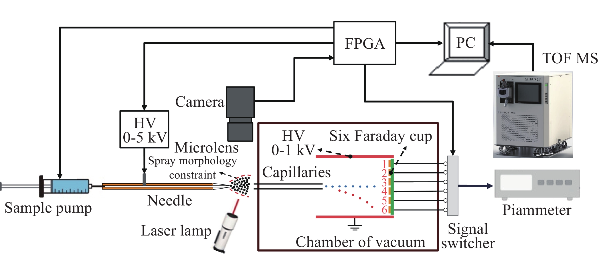 飞行时间质谱仪:成都艾立本科技有限公司产品;Fusion 100T注射泵:美国赛默飞世尔科技公司产品;高压电源:美国 Gamma High Voltage公司产品;纳升电喷雾电离源、毛细管常压接口、真空腔体、电动三维平移台:实验室自制;U1252B五位半万用表:美国安捷伦科技有限公司产品;Model-6487皮安表:美国吉时利仪器公司产品;高清摄像机(像素1 080 p,帧率60帧):深圳全瑞视讯科技有限公司产品;显微镜头(放大倍数5倍,焦距40 mm):上海兆仪光电科技有限公司产品;Artix-7系列芯片FPGA控制板:美国XILINX公司产品。整体实验平台示意图及关键部件实物图示于图3。