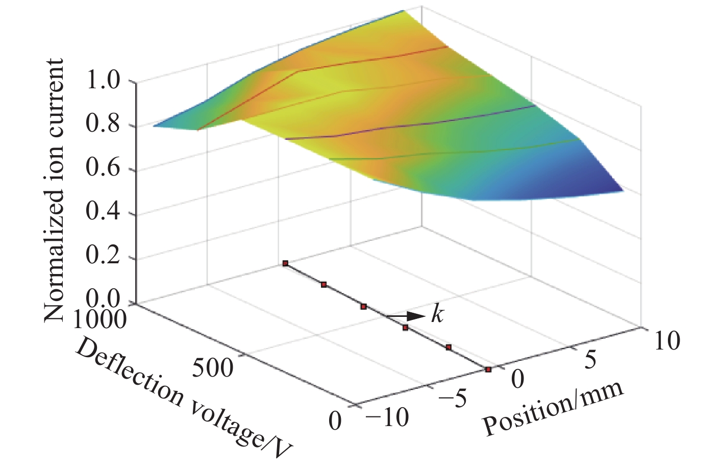 在上下极板间不施加偏置电压的情况下,带电粒子流会相对均匀地到达后侧法拉第杯,6路法拉第杯的信号强度相对于中心位置呈对称分布。取6路法拉第杯的信号强度总和作为衡量离子源信号强度的指标,依次在装置的上极板施加0、200、400、600、800、1 000 V偏置电压,下极板始终接地,在偏置电压的作用下,带电粒子出现向下偏转的情况,随着偏置电压的增加,整体偏移程度增大,示于图4。取偏置电压作用下带电粒子流的偏移斜率k(拟合不同偏转电压下带电粒子流分布曲线的重心)作为衡量离子源去溶剂化效率的指标。