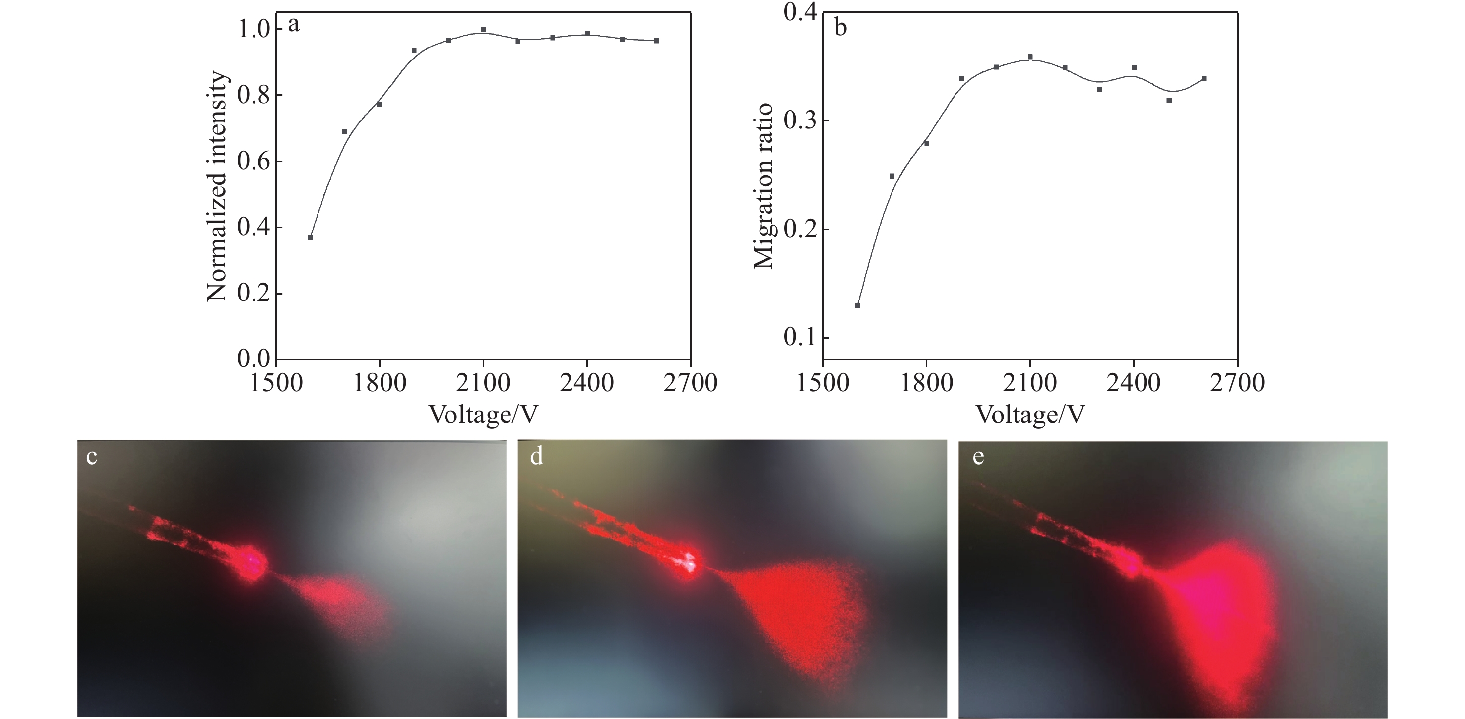 固定其他条件不变,考察样品激发电压对NanoESI信号强度及去溶剂化效率的影响。样品进样速率0.30 μL/min时,依次采用1 600、1 700、1 800、1 900、2 000、2 100、2 200、2 300、2 400、2 500、2 600、2 700 V激发电压进行测试。在不施加偏转电压的情况下,6路法拉第杯的总信号强度示于图5a;施加0~1 000 V偏置电压后,带电粒子流的偏移斜率k示于图5b;激发电压1 600、2 100、2 700 V时的喷雾形态分别示于图5c~5e。可以看出,激发电压过低时,不足以使当前流量下的所有溶液完成电离,液体可能无法生成有效的泰勒锥,以至于喷雾不能完整形成,此时的离子化效率极低,信号强度非常低甚至无法被检测到;当激发电压达到2 100 V时,信号强度达到最高,因流量和电压匹配得当,离子源的去溶剂化效率达到峰值;继续增大电压,此时信号强度不再明显攀升,且出现信号跳跃严重、喷雾状态不稳定等问题,可能原因是高压会导致放电或产生过多的碎片离子,同时使液滴携带更多的电荷,液滴的库仑裂解发生得更早、更频繁,进而影响喷雾的质量和离子源的去溶剂化效率。