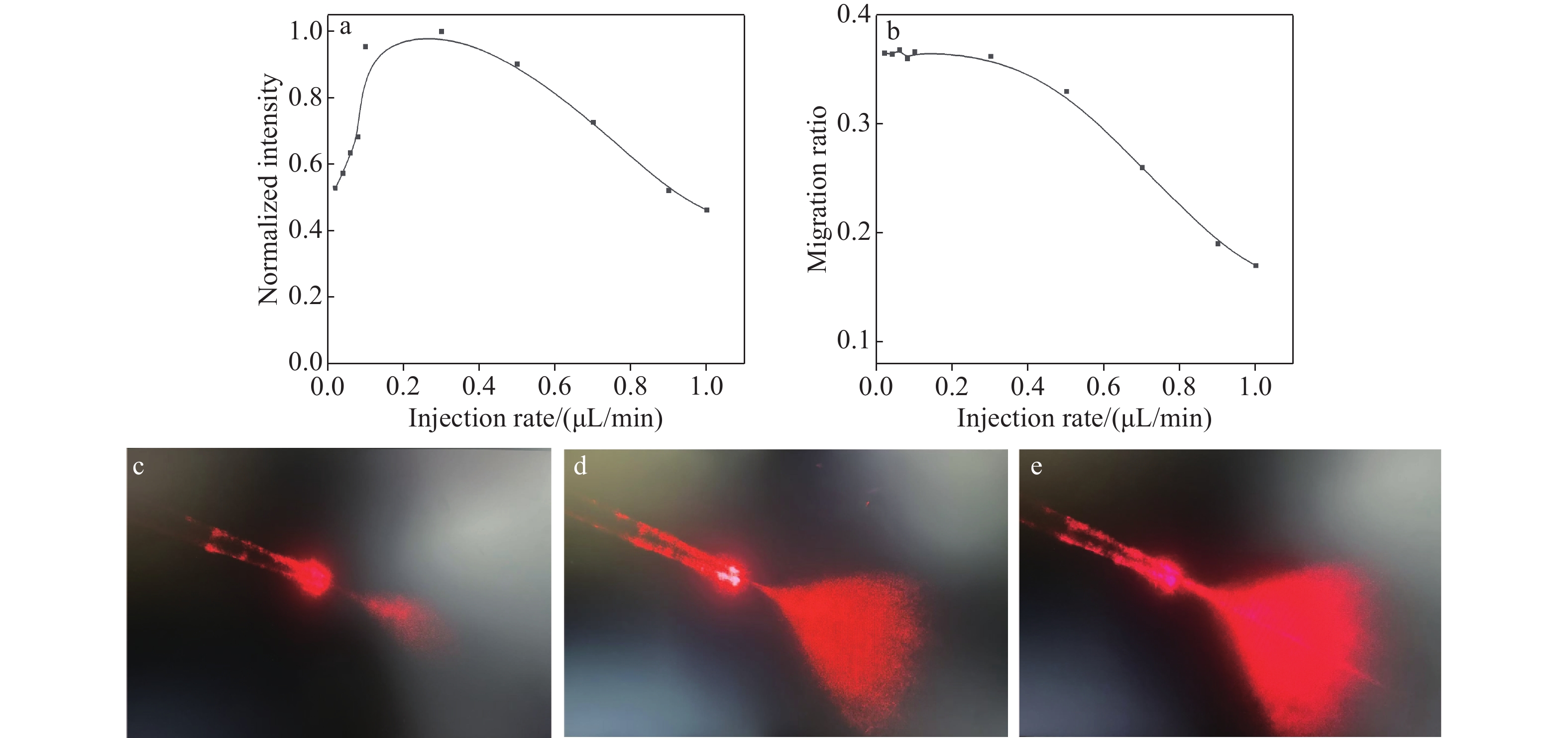 Figure 6. Signal intensity of charged particle flow at different injection rate (a), offset slope of charged particle flow (b), spray shapes of injection rate at 0.01 μL/min (c), 0.30 μL/min (d) and 1.00 μL/min (e)