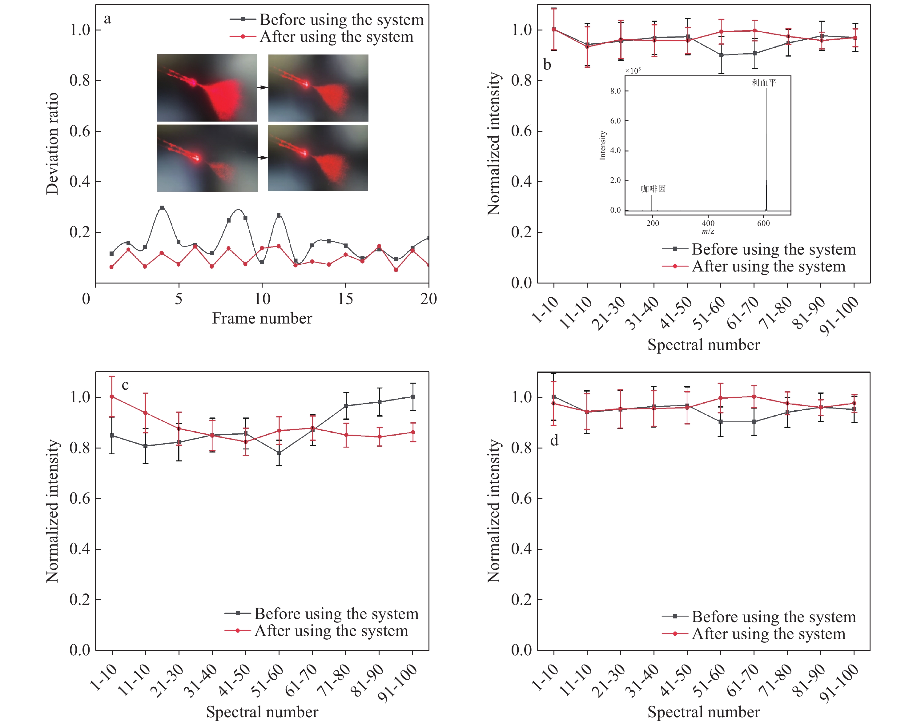 为评估该自动控制系统对质谱分析的影响,对质谱仪所测得的总离子流、咖啡因及利血平的信号强度(由峰面积积分得到,积分时间1 s)进行分析,结果示于图7b~7d。系统作用前后,在相同条件下分别连续采集100幅谱图,以每10幅谱图的平均信号强度绘制1个点。通过计算总离子流信号强度的标准差来衡量数据的波动程度,引入系统后,信号强度变得相对稳定。系统作用前后,总离子流信号强度的标准差分别为3.26%、2.21%,平均误差范围(