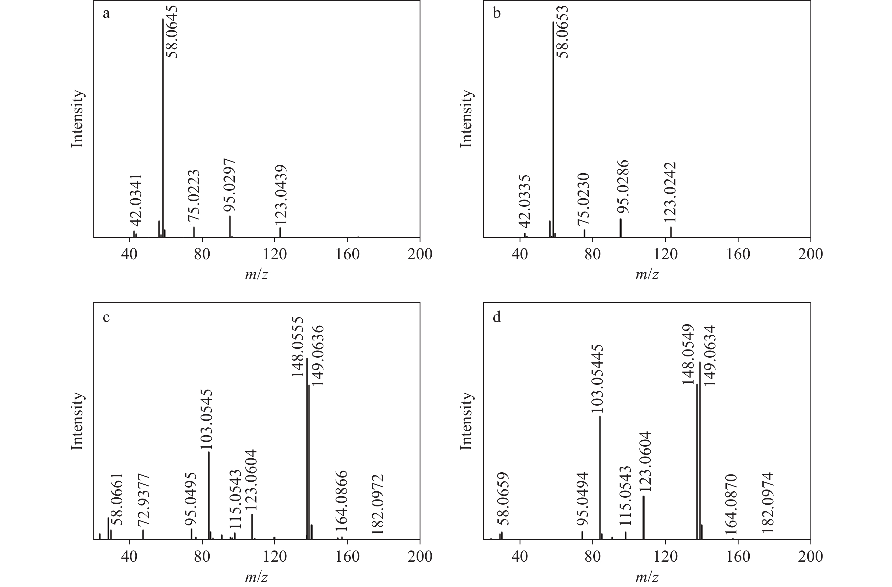 3-FMC和4-FMC的气相色谱峰的EI-MS质谱图分别示于图2a、2b,裂解途径示于图3,两者具有相似的碎片离子和裂解方式。前体离子m/z 181经化学键断裂生成碎片离子m/z 123和58。碎片离子m/z 123失去1分子CO生成碎片离子m/z 95,进一步失去1分子HF生成碎片离子m/z 75。另一方面,碎片离子m/z 58失去1分子CH4生成碎片离子m/z 42。