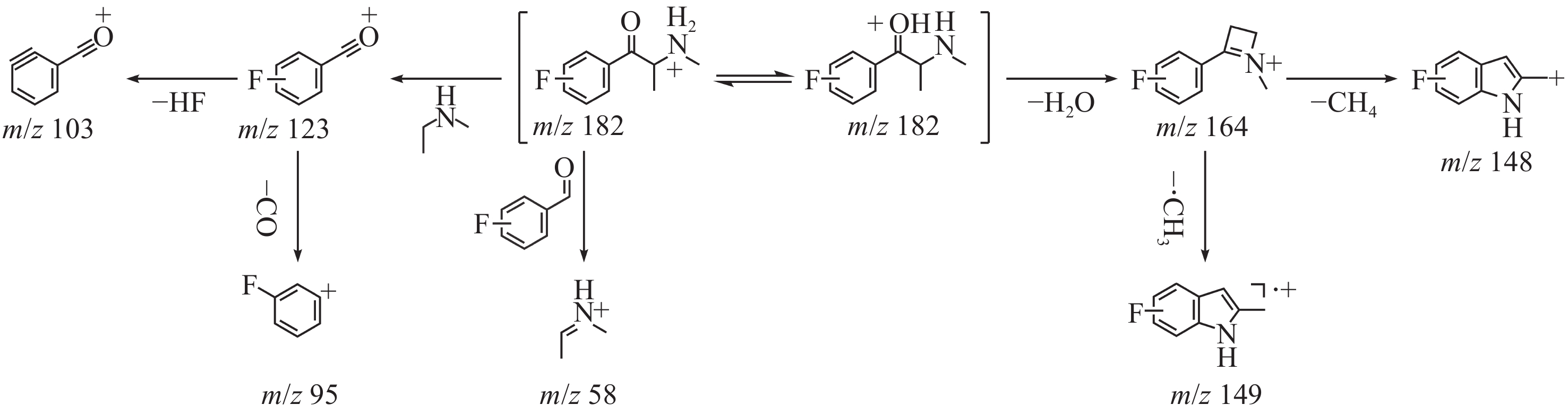 3-FMC和4-FMC的液相色谱峰的ESI-CID-MS/MS二级质谱图分别示于图2c、2d。与EI-MS不同,在ESI-CID-MS/MS模式下,虽然3-FMC与4-FMC具有相似的碎片离子,但丰度明显不同。3-FMC和4-FMC的ESI-CID-MS/MS碎裂途径示于图4。母离子m/z 182丢失1分子H2O生成碎片离子m/z 164,进一步丢失1分子CH4生成碎片离子m/z 148,或失去1分子甲基自由基生成碎片离子m/z 149。母离子m/z 182还可通过苯环侧链碳键断裂生成碎片离子m/z 123和58。此外,碎片离子m/z 123丢失1分子HF或1分子CO后,分别生成碎片离子m/z 103或95。