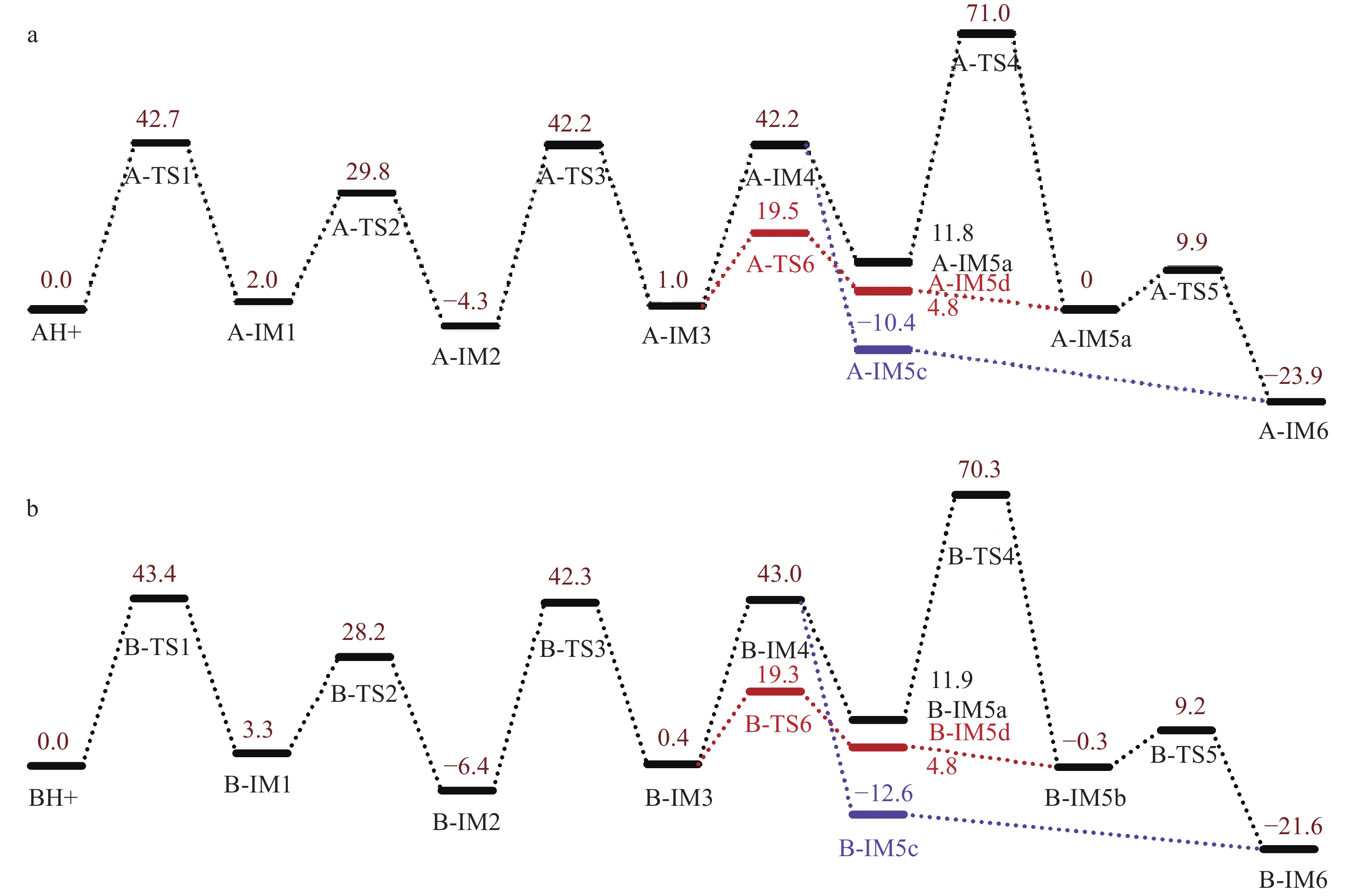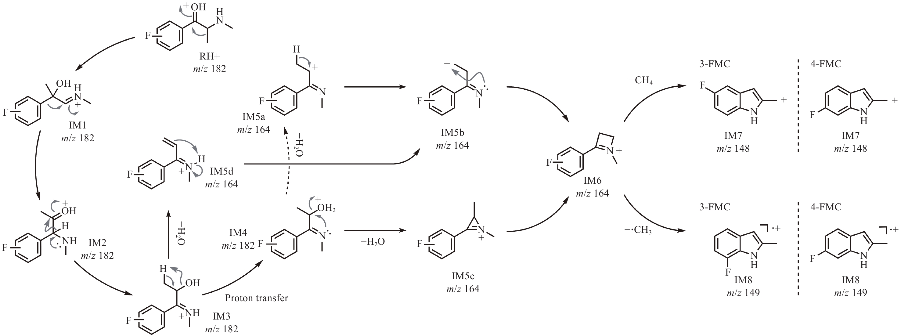 为进一步分析3-FMC和4-FMC的ESI-CID-MS/MS谱图差异,采用计算化学法研究二者的裂解机理。结果表明,3-FMC和4-FMC的ESI-CID-MS/MS裂解过程被中间体IM5系列(IM5a、IM5b、IM5c和IM5d)和IM6分为2个阶段,示于图5。第一阶段为分子内脱水成环反应。首先通过三步迁移生成N-质子化的β-羟基亚胺异构体(IM3),IM3为脱水反应提供了合适的结构基础,这也是α-羟基N-苯基胺重排反应[21]的一种变体。中间体IM5经系列异构化形成具有四元环侧链的稳定中间体IM6,这是碎片离子m/z 164产生的主要原因。由于IM3-TS6-IM5d的能垒较低,热力学上更具优势,该阶段的反应主要沿IM3-IM5d-IM5b-IM6路径进行,通过β-消除脱水、质子转移和分子内成环三步完成。3-FMC和4-FMC生成中间体IM6的吉布斯自由能分布情况示于图6。可以看出,由3-FMC和4-FMC生成中间体IM6具有相似的裂解机理。由中间体IM3生成IM6的最有利途径为中间体IM5d直接脱水,3-FMC和4-FMC完成该过程分别需要克服77.4和79.1 kJ/mol的能垒。由于裂解过程中没有外部质子源,经IM4(172.5和178.2 kJ/mol)途径的分子内质子转移在能量上是不利的。此外,在动力学上,更易发生从IM5b到IM6的环合反应,其能垒更低,分别为41.4和39.5 kJ/mol。