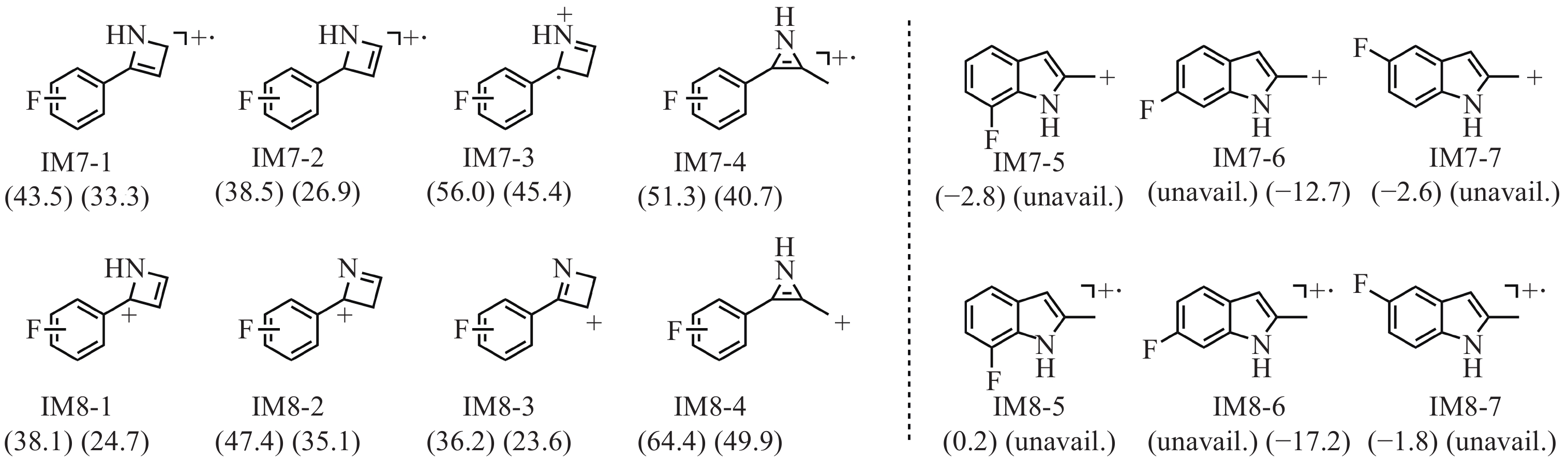基于一般经验无法推断中间体IM6进一步裂解生成碎片离子IM7(m/z 148)和IM8(m/z 149)的过程。因此,需通过相对吉布斯自由能进行理论预测,对所有保留氟苯基结构的可能异构体进行筛选,才能确定这2个未知片段的最稳定结构。基于相对吉布斯自由能筛选出的IM7和IM8可能结构示于图7。可见,IM7-5和IM8-7是3-FMC生成相应碎片的最有利结构,对于4-FMC来说,则是IM7-6和IM8-6,且这些结构所需的能量在电喷雾离子化二级质谱裂解的合理能量范围之内。对于3-FMC,IM7-5(−11.7 kJ/mol)的相对吉布斯自由能比IM8-5(0.8 kJ/mol)低;而对于4-FMC,IM8-6(−72.0 kJ/mol)的相对吉布斯自由能比IM7-6(−53.1 kJ/mol)低。ESI-CID-MS/MS结果表明,3-FMC的碎片离子m/z 148的丰度高于碎片离子m/z 149,而4-FMC则相反,这与理论分析一致。
