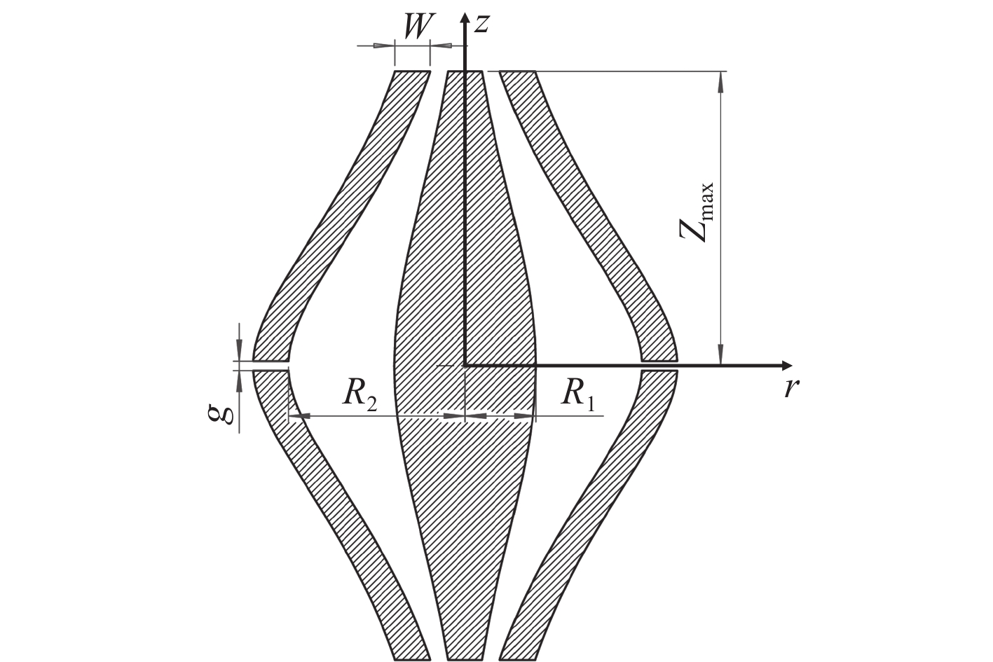 • 静电场轨道阱由内部的纺锤形电极和与之对应的外部电极组成,示于图1R1R2分别表示内电极和外电极的最大半径,外电极厚度为W;外部电极在中间(z=0)处分为两部分,用于镜像电流检测[27],外电极劈裂大小为g;离子通过外部电极上的1个孔(图中未显示)注入到Orbitrap中。其中,径向坐标$ {r}^{2}={x}^{2}+{y}^{2} $xyz是笛卡尔坐标,设定z轴为对称轴。内外电极的几何形状为[27]