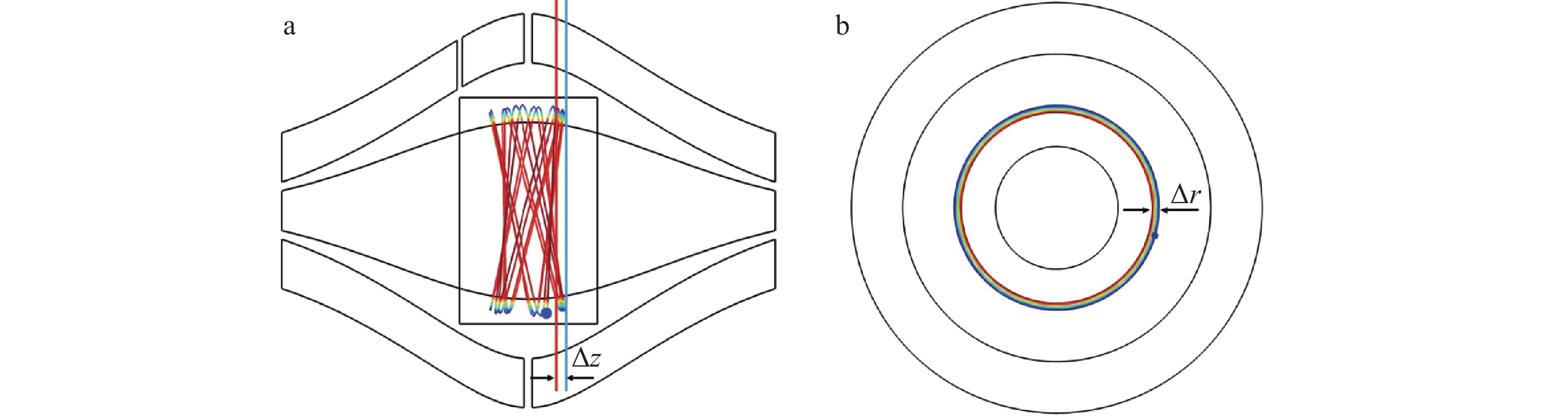 其中,C是常数,k是电场曲率。待分析离子从外部离子源通过脉冲注入Orbitrap后,可被静电场轨道阱约束;离子的运动包括围绕中心电极的旋转运动和沿中心轴方向的谐振运动。离子沿中心电极(z轴)方向的运动频率$ {\omega }_{\textit{z}} $为: