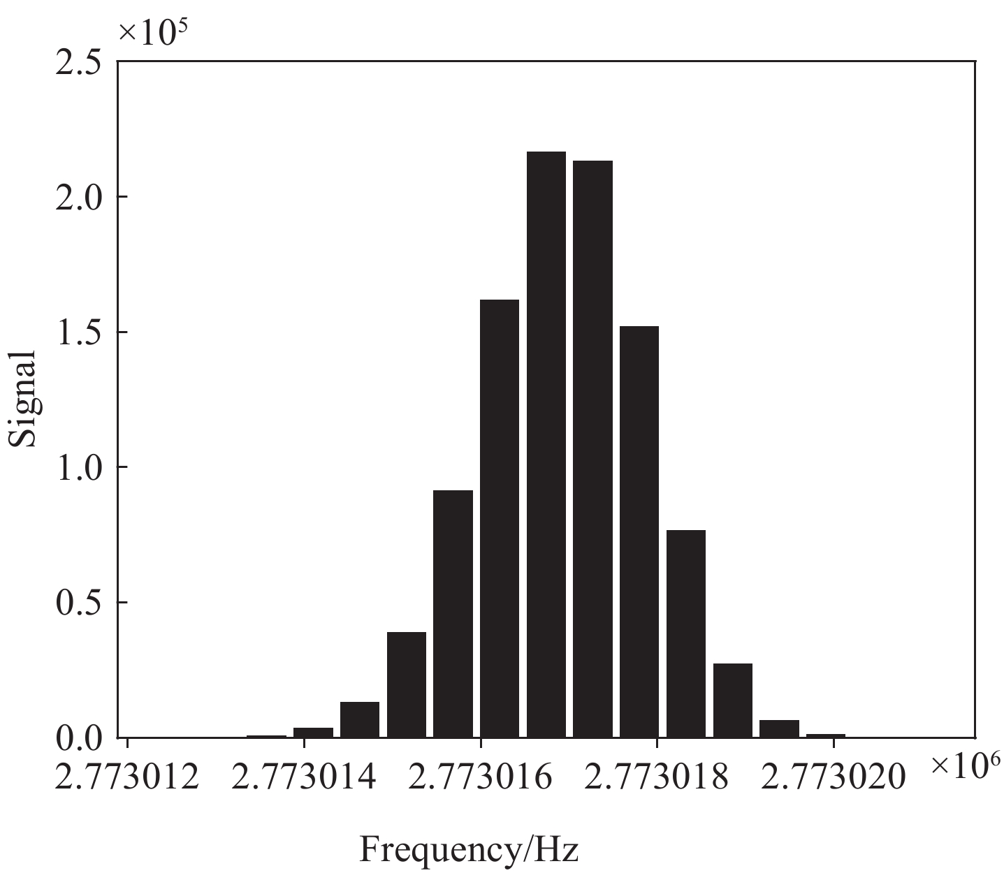 在外电极劈裂0.8 mm、轴向截断长度10 mm时,强场型轨道阱C4系数整体比标准型低2个数量级。随着截断长度的增加,强场型轨道阱的C4系数值逐渐接近标准型。强场型轨道阱的C4系数在半径10~50 mm范围内呈现约2个数量级的变化,而标准型轨道阱的C4系数在此范围的变化超过4个数量级,表明轴向电极尺寸对标准型轨道阱的影响更显著。这是由于强场型轨道阱的内电极半径更大,形成了更强的电势场,从而减弱了轴向电极尺寸截断对电势分布的影响。本研究同时给出了外电极劈裂0.1、0.01 mm的情况,其中,外电极劈裂0.01 mm是为了近似模拟没有劈裂的理想情况。不同外电极劈裂大小的系数值变化趋势一致,然而,随着外电极劈裂依次减小,C4系数值依次降低2个数量级,这是由于外电极劈裂减小对电势场缺陷的影响减弱。基于上述参数,并按照第2节介绍的参数计算离子运动范围内对应的频率分布。外电极劈裂0.1 mm、轴向长度50 mm时,标准型轨道阱的模拟分辨率结果示于图3。其中,中心频率$ f= 2.77\times {10}^{6}\;{\mathrm{Hz}} $、频率分布的半高全宽$ \Delta f = 0.933\;{\mathrm{Hz}} $,由此计算质量分辨率$ R = 1.49\times {10}^{6} $