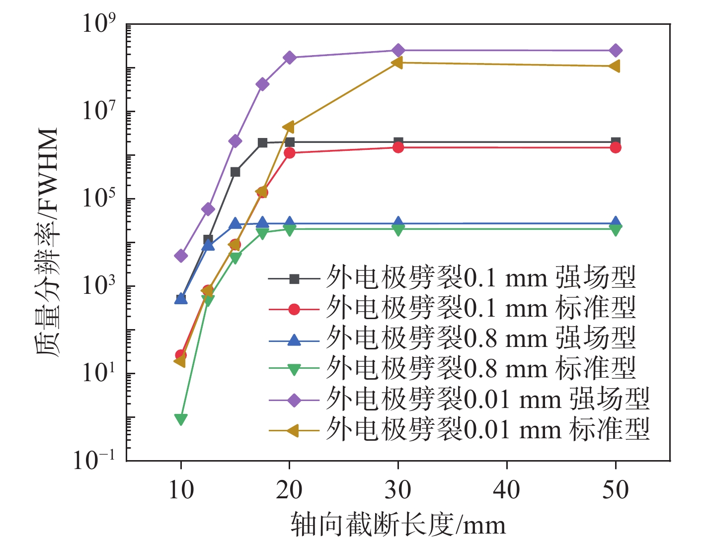 不同轴向截断长度时,静电场轨道阱分辨率示于图4,其中质量分辨率采用对数坐标。可见,对于不同外电极劈裂大小,随着静电场轨道阱轴向截断的增加,质量分辨率呈先增大后稳定的趋势;强场型分辨率整体高于标准型,外电极劈裂越小,质量分辨率越高;在外电极劈裂0.01 mm,轴向截断超过30 mm时,2种轨道阱的质量分辨率均稳定在$ {10}^{8} $左右,这是由于外电极近乎无劈裂,分辨率主要受轴向截断影响。由于实际生产中无法呈现完美电极的情况,本研究着重讨论外电极劈裂0.1、0.8 mm的情况:1)对于强场型轨道阱,轴向截断长度大于17.5 mm时,达到稳定的质量分辨率$ 2.00\times {10}^{6} $(外电极劈裂0.1 mm)和$ 2.74\times {10}^{4} $(外电极劈裂0.8 mm),此时继续增加轴向截断长度对质量分辨率的影响可忽略;标准型轨道阱的质量分辨率在轴向截断长度20 mm时接近稳定,分别为$ 1.49\times {10}^{6} $(外电极劈裂0.1 mm)和$ 2.00\times {10}^{4} $(外电极劈裂0.8 mm),表明强场型轨道阱轴向截断对电势缺陷的影响比标准型小,对质量分辨率的影响也相对较小。2)当轴向截断长度小于12.5 mm时,无论外电极劈裂大小,2种模型的质量分辨率均低于$ {10}^{4} $;当轴向截断长度为10 mm时,强场型轨道阱分辨率不足103,标准型轨道阱分辨率不足102,表明此时电势场畸变严重。3)当轴向截断长度在10~15 mm时,无论外电极劈裂大小,强场型分辨率均高于标准型,此时轴向截断带来的影响占主导;当轴向截断大于17.5 mm时,外电极劈裂对电势场的影响占主导,无论是强场型还是标准型,外电极劈裂0.1 mm时的分辨率比0.8 mm时高约2个数量级。