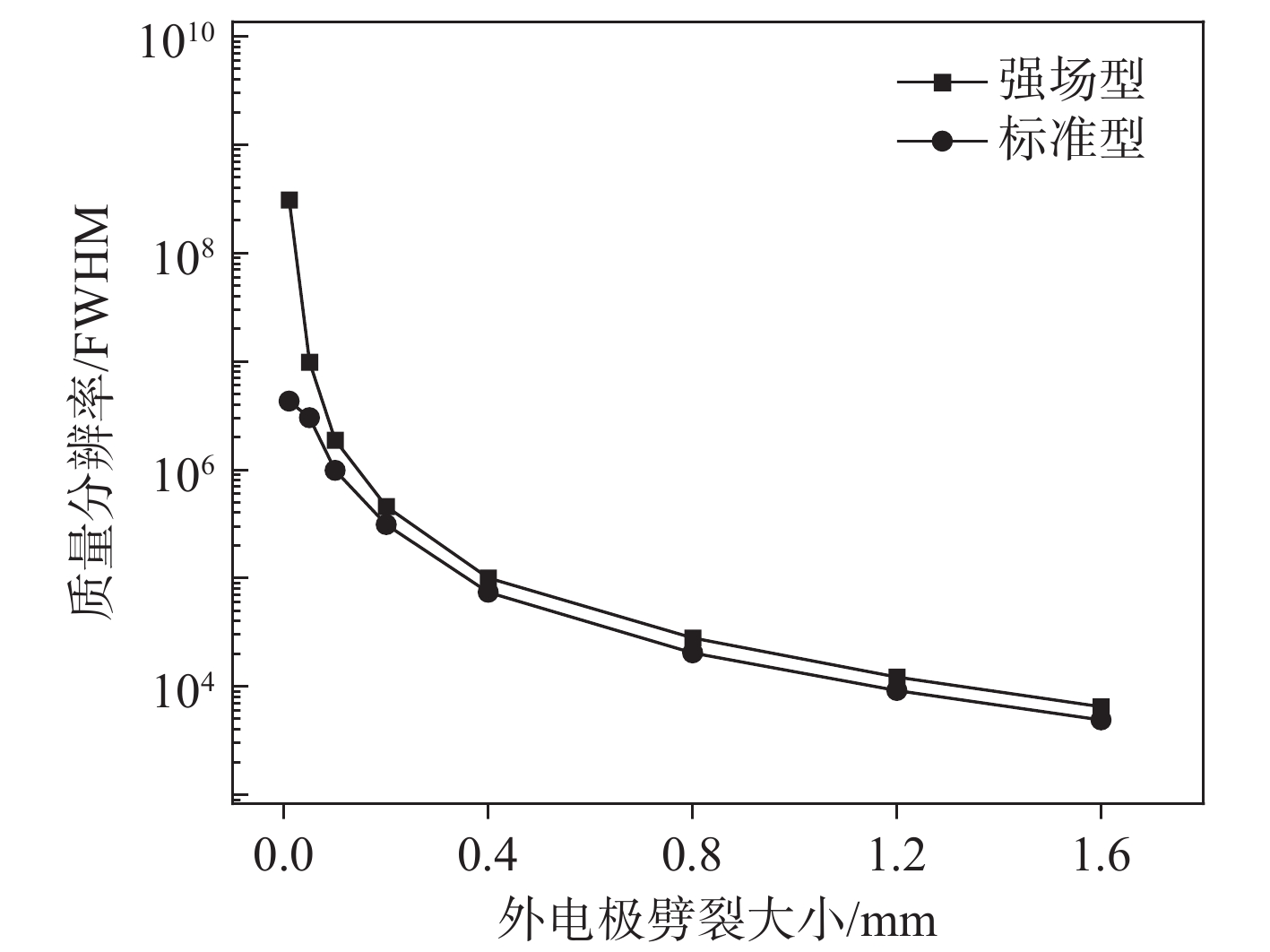 在不同外电极劈裂大小时,静电场轨道阱分辨率示于图5。可知,无论外电极劈裂大小,强场型轨道阱质量分辨率普遍高于标准型轨道阱,且静电场轨道阱质量分辨率随着劈裂的增大显著降低。当外电极劈裂0.01 mm时,强场型质量分辨率高于标准型约2个数量级,此时强场型和标准型的分辨率分别为$ 1.71\times {10}^{8} $$ 4.31\times {10}^{6} $,原因在于强场型具有更小的高阶谐振项系数。随着外电极劈裂的进一步增大,其对分辨率的影响逐渐占主导地位,2种模型的分辨率差距逐渐缩小,但强场型轨道阱的分辨率仍优于标准型。当外电极劈裂大小超过1.2 mm时,2种模型的质量分辨率均低于$ {10}^{4} $,相对于外电极劈裂0.01 mm,强场型和标准型轨道阱的分辨率分别下降了3个和2个数量级。当外电极劈裂为1.6 mm时,强场型和标准型分辨率分别为$ 6.53\times {10}^{3} $$ 4.91\times {10}^{3} $,均大幅降低,且呈进一步下降的趋势。