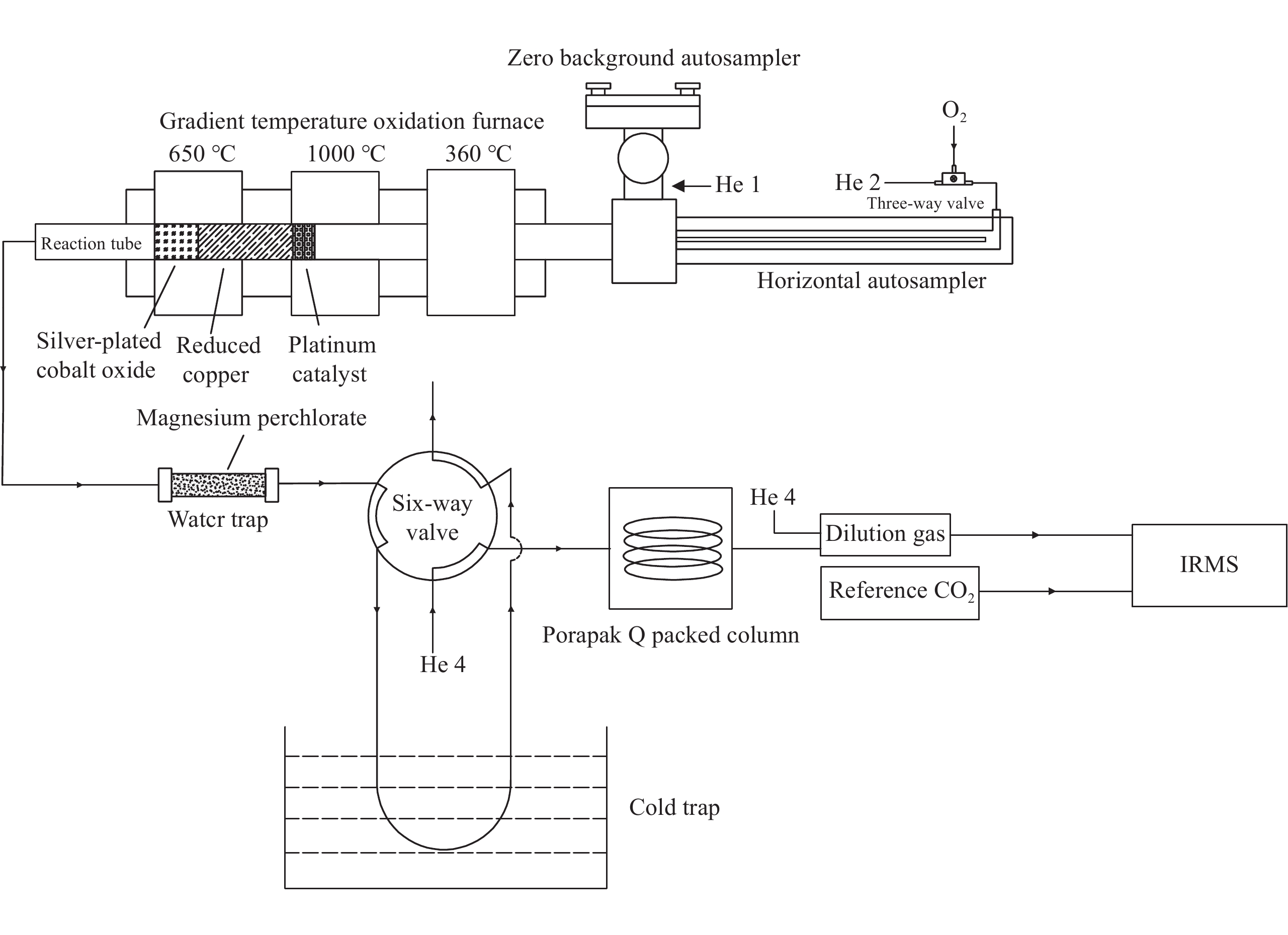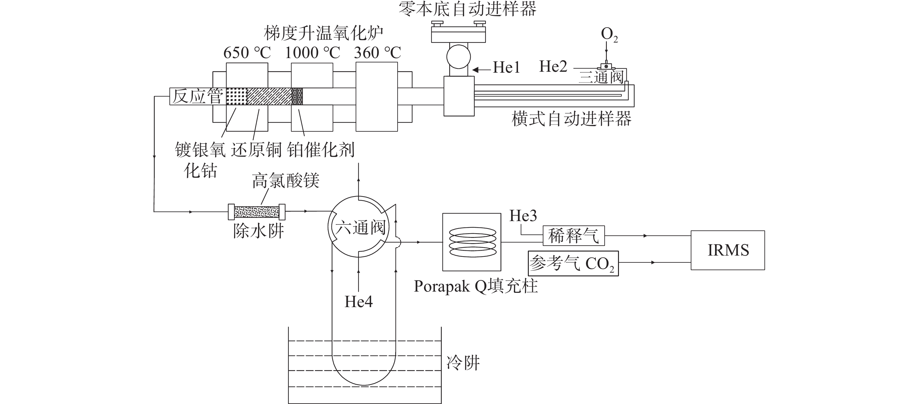 • 碳质组分稳定同位素在线分析系统示意图示于图1,主要由载气(He)压力及流速调节装置、载气净化系统、六通阀、自动进样系统、温度梯度氧化炉系统等部分组成。