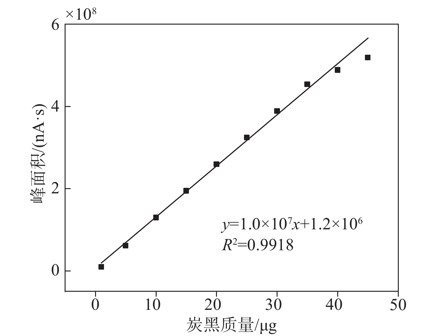 • 首先对空白样品进行4次重复测定,记录每次测量的信号值;随后将5、10、15、20、25、30、35、40、45 μg炭黑Super P Li标准品依次上机测试,每个质量点进行3次平行测定。实验结果显示,炭黑Super P Li标准品在10~45 μg范围内,其峰面积(y)与对应质量(x)呈良好的线性关系,相关系数(R2)为0.992,示于图5