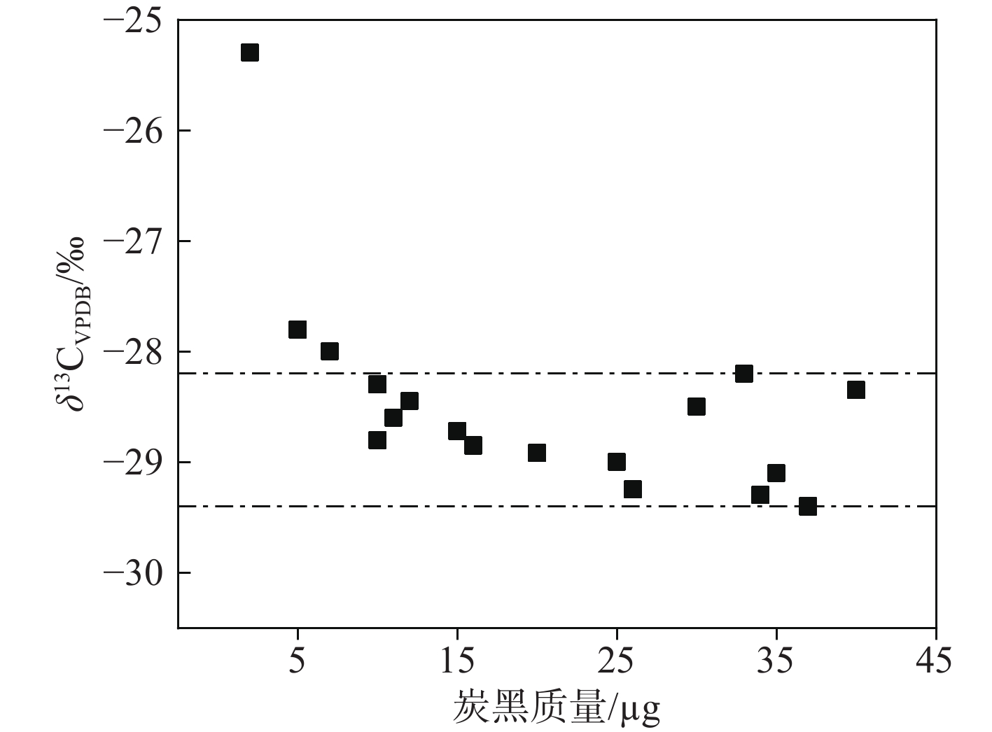 不同质量炭黑Super P Li的δ13C测试结果示于图6δ13C在(−28.87±0.59)‰范围内波动。当样品质量低于10 μg时,δ13C值出现显著不稳定,波动超出标准偏差范围。这是因为样品量较小时,空白中微量碳杂质或其他干扰物的相对影响增加,尽管已进行空白扣除处理,但仍可能影响低质量样品的测定结果。因此,样品含碳量须大于10 μg才能获得较准确的结果。图4a显示,OC与BC的空白峰信号强度约为0.5 nA,对应碳质量为1~1.5 μg。由于该质谱仪信号强度超过20 nA时趋于平峰,故当前条件下样品的最大检出质量约为45 μg。