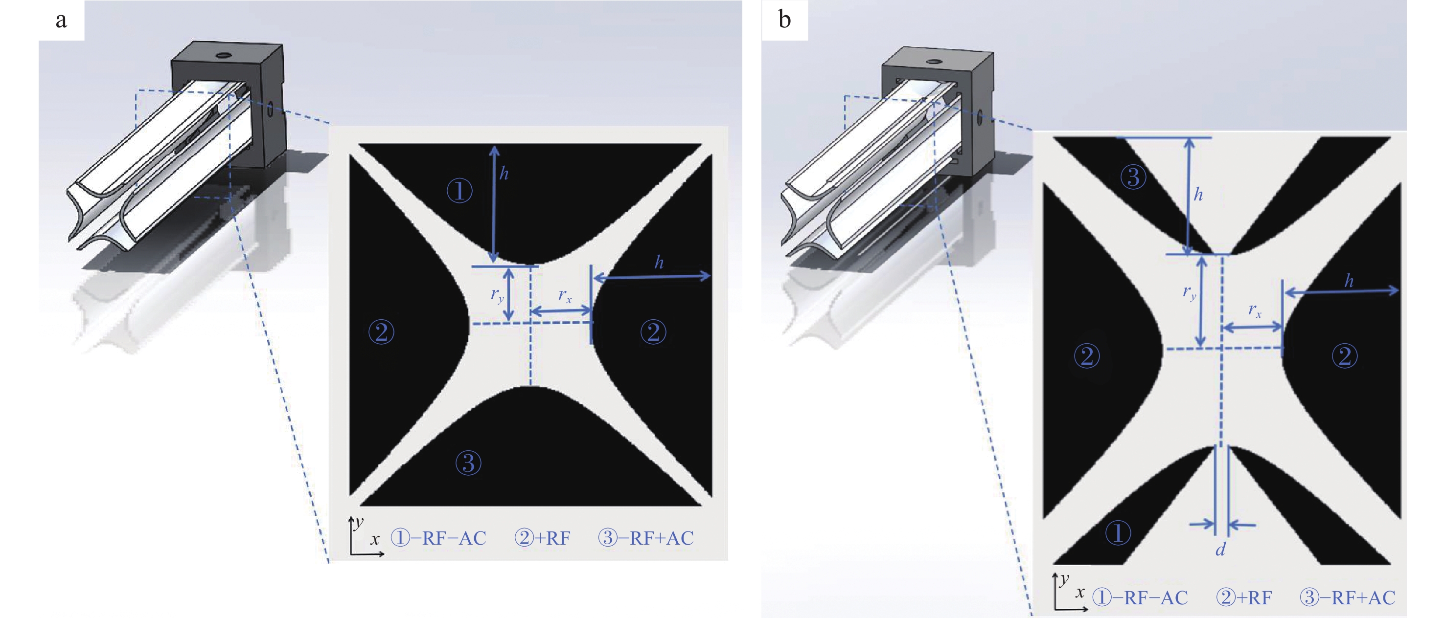 • 本研究设计的极微型双曲面线性离子阱(M-HLIT)由2对双曲面电极构成,整体结构示意图示于图1。理想结构由2对双曲面电极组成,为简单的中心对称结构,即rx=ry=1 mm。在“拉伸”结构中,为弥补离子出射槽对电场成分造成的影响,将开设离子出射槽的电极沿出射方向向外平移,偏离原有位置,因此,y电极与几何中心之间的距离ryrx。将ry/rx定义为“拉伸”比;出射电极的开槽宽度为d;由于双曲面电极无法无限延伸,定义电极顶部到电极底部的距离为电极截断长度h。将2个相位差为180°的平衡RF信号施加于2对电极上以产生四极场,并在2个出射电极之间施加补充AC信号,实现离子的共振出射。