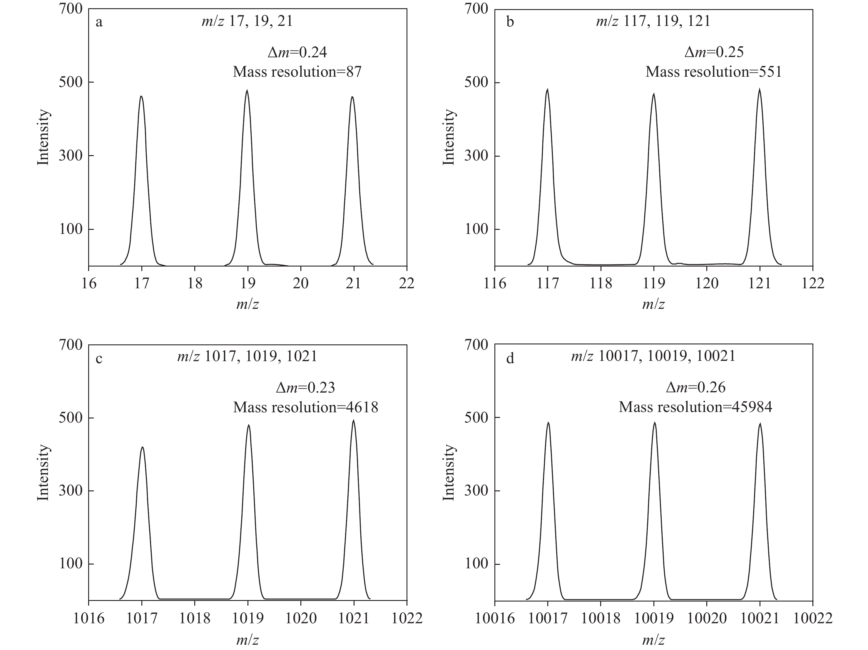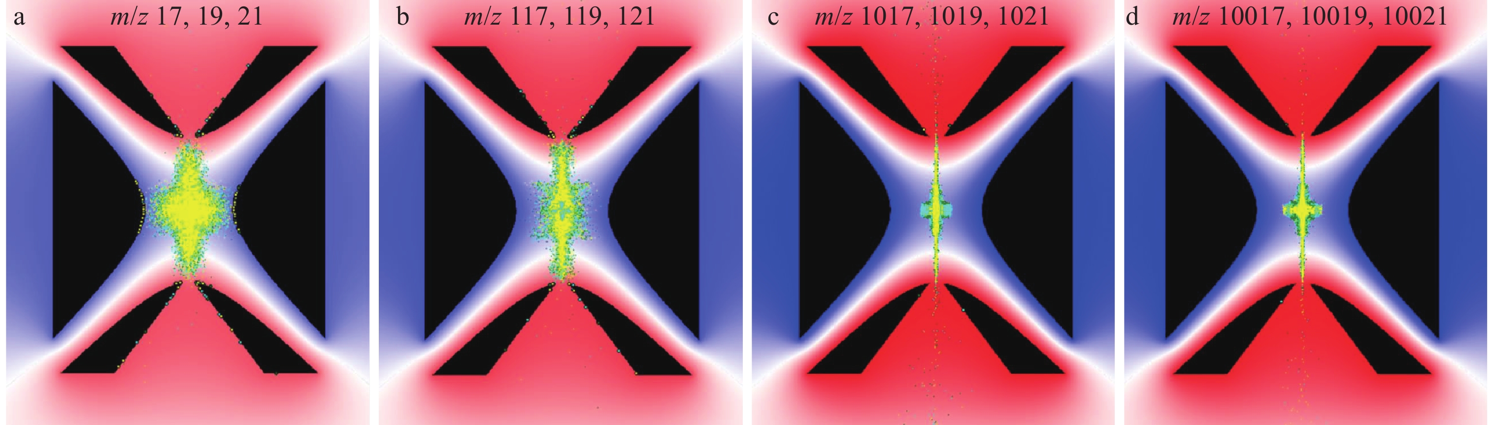 • 为进一步研究微型M-HILT的分析特性,本文模拟了不同质荷比离子的质量分辨率。模拟过程中,结构参数和电参数采用上述优化后的最佳值,将不同质荷比的离子分为4组:第1组包括m/z 17、19、21;第2组包括m/z 117、119、121;第3组包括m/z 1 017、1 019、1 021;第4组包括m/z 10 017、10 019、10 021。每个质荷比离子的数量为100个。对应的质谱图及离子运动分布图示于图1011。通过计算发现,低质荷比(m/z 19)离子的质量分辨率(87)显著低于高质荷比(m/z 10 019)离子的质量分辨率(45 984)。此外,由图11可知,在离子出射阶段,低m/z离子在阱内的运动轨迹较宽,这是由于场半径1 mm的M-HLIT需要施加远高于常规离子阱的射频电压和频率,导致大量低m/z离子在出射槽口发生湮灭,从而降低质量分辨性能。这一现象表明,M-HLIT在处理低m/z离子时存在一定局限性,但对高m/z离子分析具有一定优势,需进一步优化设计以提高其通用性。