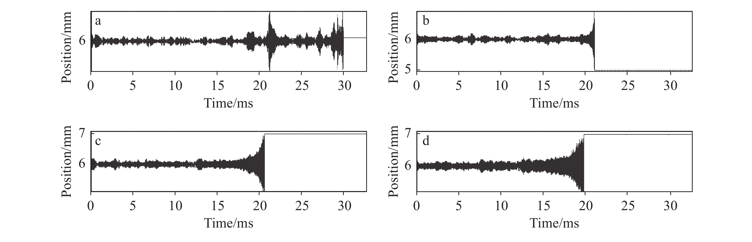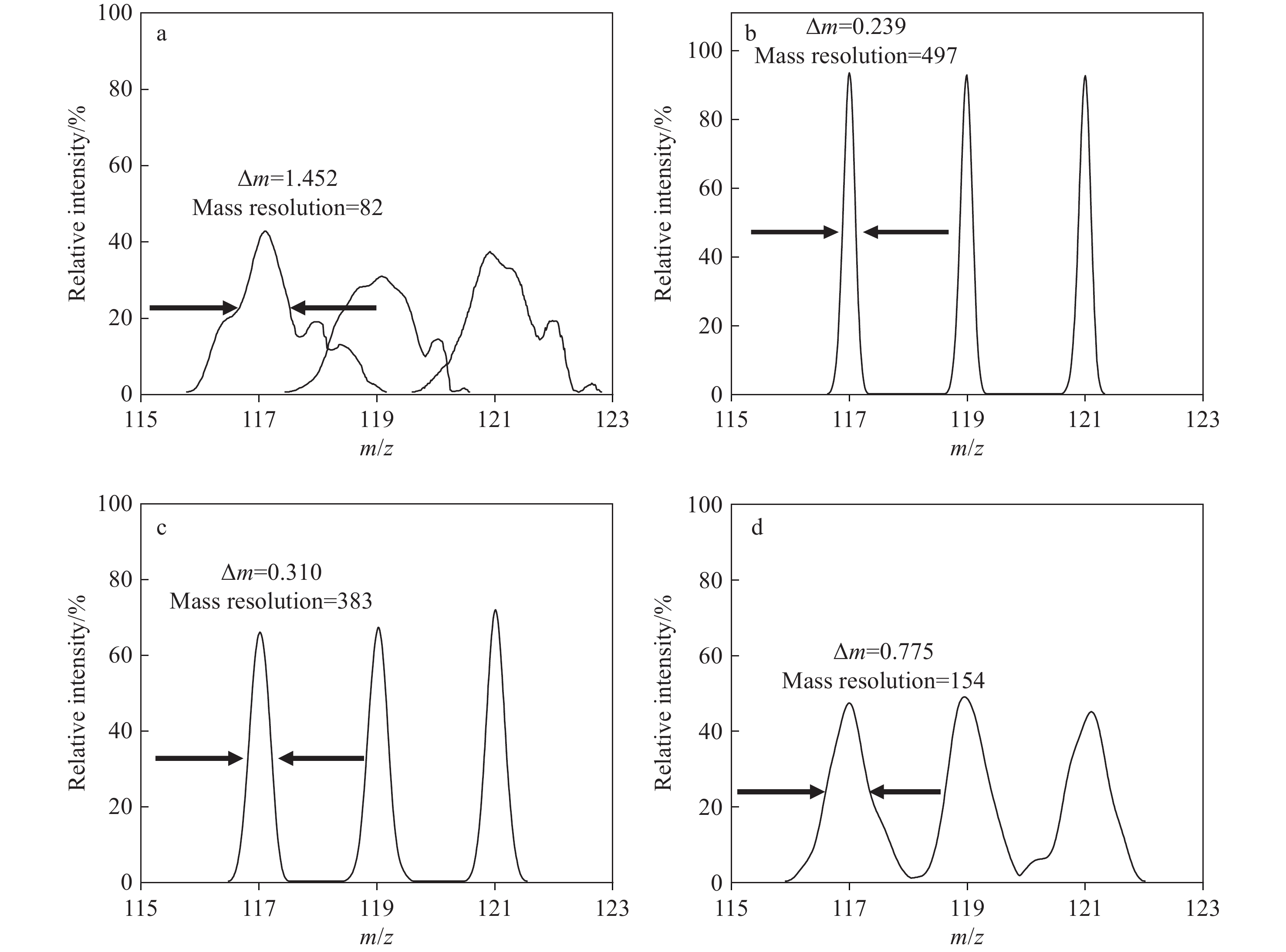 模拟结果表明,当AC幅值为0.2 V时,离子的出射运动轨迹为最理想的“喇叭”形,示于图2b。离子在四极场中首先经历稳定的简谐振动,当离子的久期频率与共振激发频率匹配时,能够瞬间高效吸收能量并实现共振出射,对应的质谱峰分辨率最高,示于图3b。当AC幅值低于最优值(仅为0.1 V)时,结果示于图2a。离子无法瞬间获得足够的出射能量,导致出射时间延长,对应的质谱峰强度下降、峰宽增加且峰形畸变严重,示于图3a。反之,当AC幅值过高时,随着AC幅值的增加,质谱峰的峰展宽愈发显著,其丰度亦呈现明显的下降趋势,示于图3c3d。当AC电压达到2.0 V时,离子运动轨迹呈现“碗”状畸变,离子在尚未抵达出射时间点时便已获得较高能量,使其运动幅度显著增大,离子间相互作用力的干扰效应也随之增强,进而对质量分辨性能产生负面影响[33]