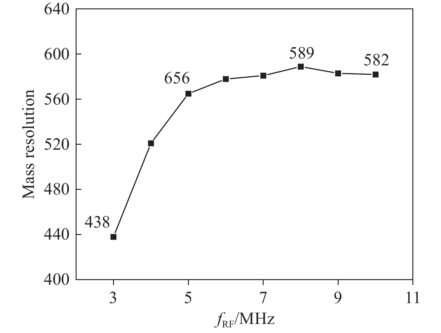 • 本研究讨论了RF频率对离子阱性能的影响。在模拟过程中,RF频率取值范围为[3 MHz, 10 MHz],取值间隔为1 MHz,AC频率始终为RF频率的1/3。质量分辨率与RF频率的关系示于图4。当RF频率在[3 MHz,5 MHz]范围内变化时,质量分辨率随频率增加呈快速上升趋势,随后增幅趋于平缓;当RF频率为8 MHz时,在m/z 117处可获得最佳质量分辨率(589);进一步增加RF频率(>8 MHz)并未带来显著的分辨率提升。同时,高RF频率会显著增加射频电源的设计难度和系统功耗,且电源体积也会相应增大,这对质谱仪的小型化设计极为不利。基于此,在保证高质量分辨率的前提下,应尽可能降低RF频率,从而在提高M-HLIT质量分辨性能的同时减小其体积。后续研究中主要采用7 MHz RF频率,以确保质谱系统的可实现性。