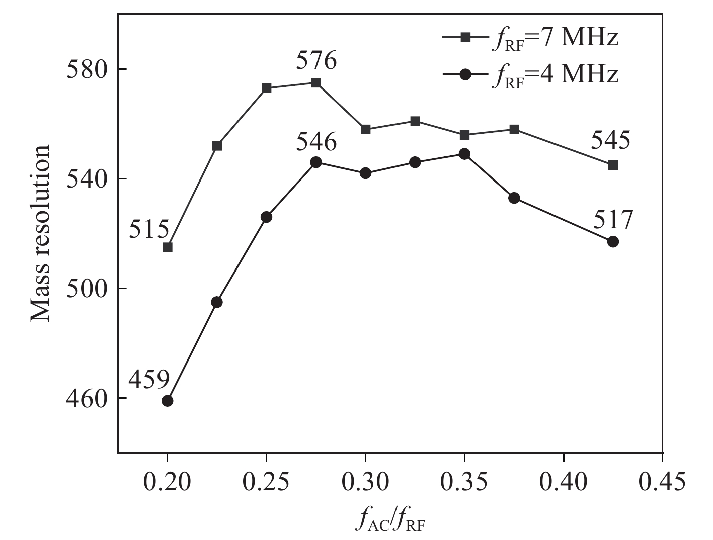 • AC频率决定了离子阱中离子出射时的q值。有研究[34-35]报道,当q值在[0.78,0.83]范围内时,通常可获得最高的质量分辨率,此时AC电压的频率约为RF电压频率的1/3。AC和RF信号的频率比(fAC/fRF)对质量分辨率的影响示于图5。本研究分别讨论了RF频率为4 MHz和7 MHz时的情况,fAC/fRF的取值范围为[0.2,0.425],步进为0.025。模拟结果表明,RF信号频率为7 MHz时获得的质量分辨率普遍优于4 MHz时,这与2.1.2节结果一致。此外,无论RF信号频率为7 MHz还是4 MHz,最优质量分辨率均出现在fAC/fRF比值为0.275附近。结果表明,对于极小半径条件下的微型离子阱,需保证共振激发频率略低于常规尺寸离子阱报道的三分频,以达到最优共振激发效果。