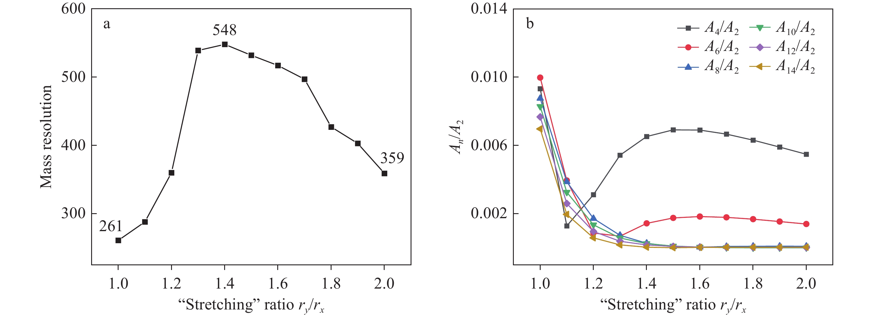 由图 6a可见,在仅采用开槽设计,尚未引入“拉伸”结构的情况下,质量分辨率仅为261,是理想结构的45.3%。结合图6b可见,此时离子阱内部高阶电场占比非常高,可证实离子出射槽对电场分布造成负面影响,使离子阱的分析性能遭受损害。而当ry/rx在[1.0, 1.4]范围内增加时,质量分辨率呈快速提升趋势,并在ry/rx=1.4时达到最佳值548,较未拉伸结构提升了110%。在此阶段,八极场(A4)和十二极场(A6)的占比呈先降后升再降的变化趋势,在ry/rx为1.4时具有较高占比,而更高阶场成分(A8A10A12A14)的占比则急剧降低,最终趋于0。该现象表明,通过“拉伸”方式引入了适当比例的A4A6场成分,改善了离子出射特性[37],同时抑制了更高阶电场的成分占比,实现了离子阱内部电场优化和质量分辨率的提升。
