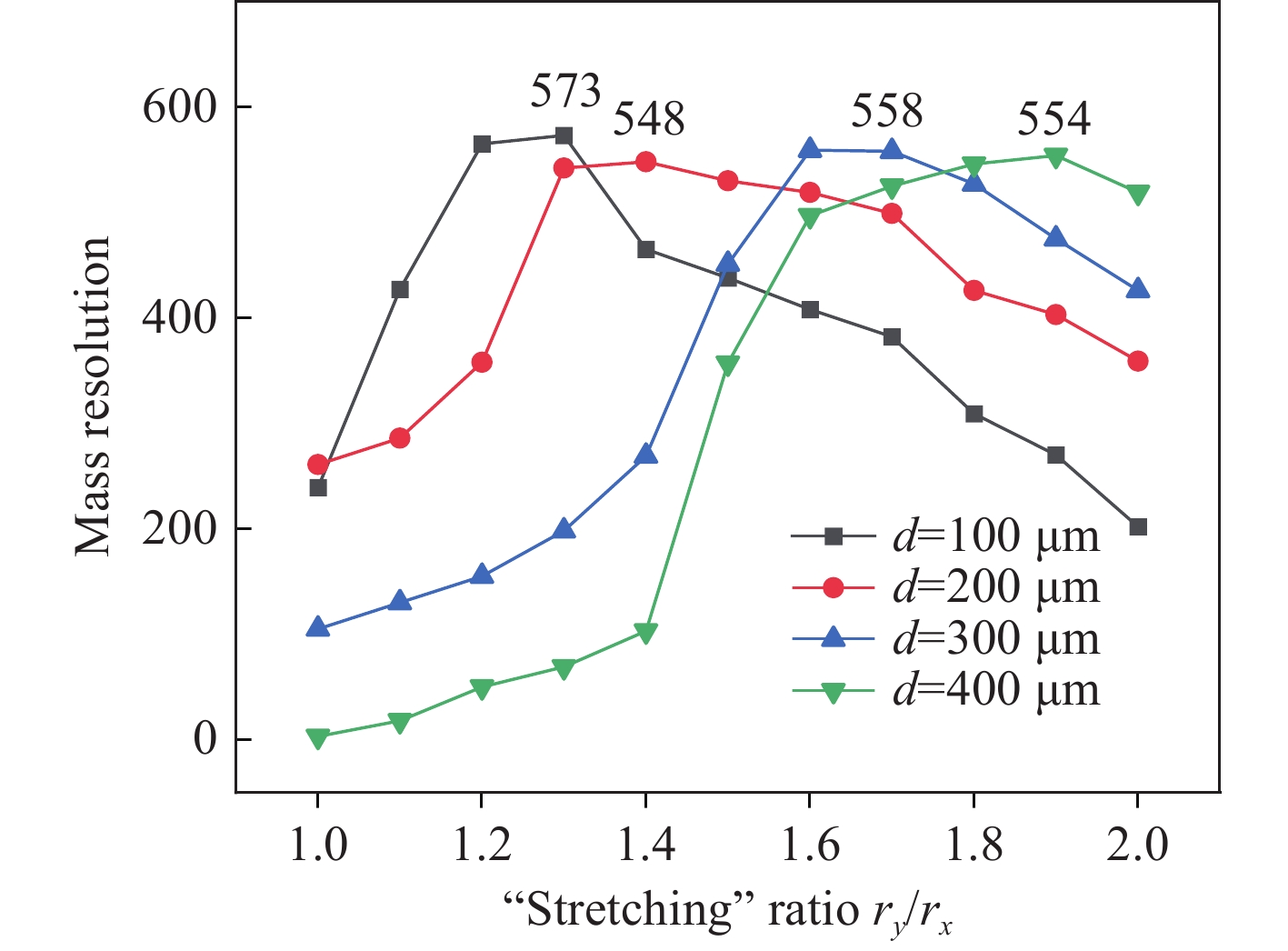 最优的ry/rx值并非绝对的,它与离子出射槽的宽度d密切相关。通过调整“拉伸”比ry/rx,可实现不同槽宽d条件下质量分辨率的优化修正,且d越大,所需“拉伸”距离越长以进行弥补,示于图7。虽然d为最小值100 μm时的质量分辨率最高(573),但由于离子在x方向上存在一定幅度的振动,过窄的狭缝易导致离子在出射过程中接触电极边缘发生湮灭,进而影响最终的出射效率。此外,这种情况对加工精度要求极高,会增加加工难度和制造成本。当d为200 μm和300 μm时,最优质量分辨率基本一致,表明离子出射槽在实际加工中允许存在100 μm左右的加工误差,这将对后续高难度曲面MEMS加工更为有利。因此,M-HLIT的槽宽度d和“拉伸”比ry/rx最优值分别为300 μm和1.6。